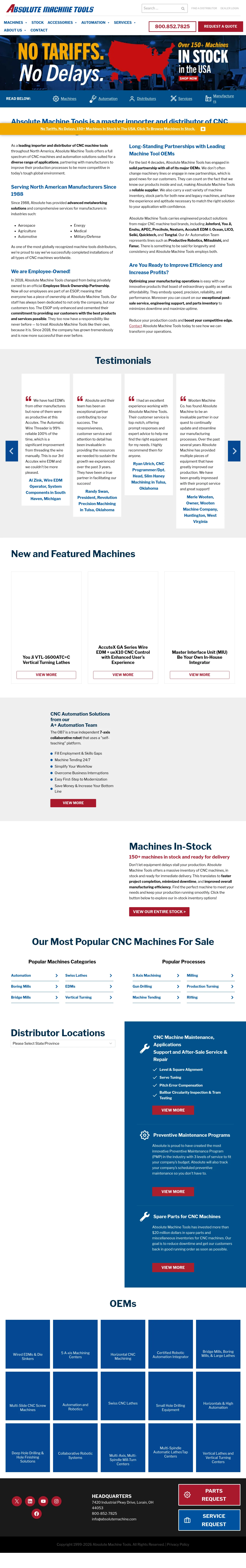 Absolute Machine Tools, Inc. is a provider of CNC machine tools and industrial automation systems serving industries such as aerospace, medical, defense, automotive, and high-volume manufacturing. The company offers a comprehensive range of machining solutions, including multitasking centers, EDM machines, grinders, and specialized deep-hole drilling equipment. Operating as a 100% employee-owned ESOP, they provide nationwide sales, technical support, and turnkey automation integration. Their services include preventive maintenance, machine monitoring, and specialized applications training to support shop floor efficiency. The firm focuses on delivering engineered solutions that improve production precision and operational throughput.