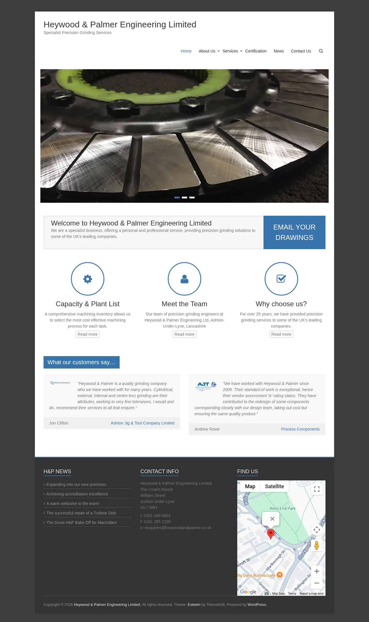 Heywood and Palmer is a specialist manufacturing company providing precision grinding solutions to a wide range of industrial clients across the United Kingdom. With over 25 years of experience, the firm delivers professional machining services tailored to the specific technical requirements of each project. They utilize a comprehensive machining inventory to identify and execute the most cost-effective processes for their clients' needs. The company serves various sectors, focusing on high-quality component production and maintenance. Their operations are supported by a commitment to technical excellence and professional service standards.