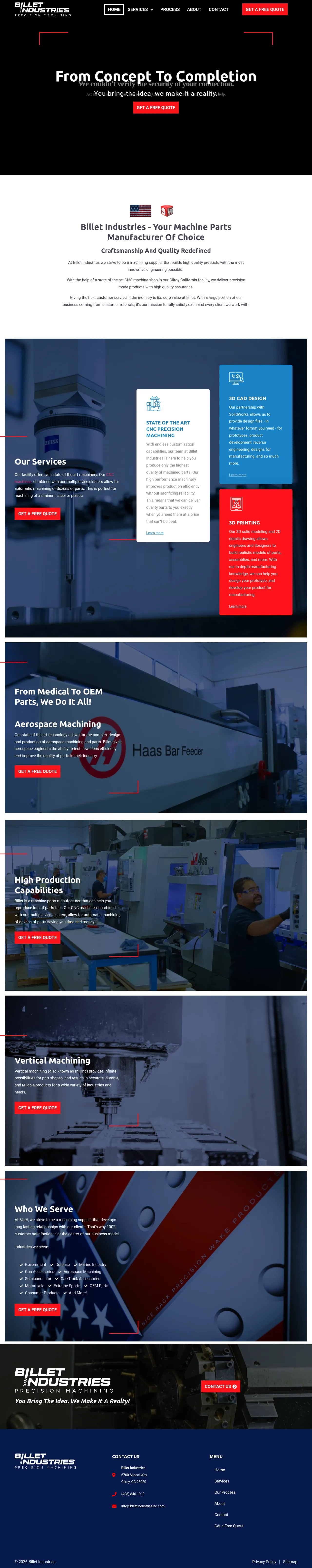 Billet Industries Inc. is a precision CNC machine shop based in Gilroy, California, providing comprehensive manufacturing services including 3D CAD design, CNC machining, and additive manufacturing. The company serves a diverse range of sectors, including aerospace, medical, marine, semiconductor, and defense industries. Their capabilities encompass vertical and horizontal multi-pallet machining, lathe turning, and custom finishing processes such as anodizing and powder coating. By utilizing advanced SolidWorks software and high-performance machining technology, the firm supports clients from prototype development through to final part assembly. Billet Industries emphasizes high production consistency, quality assurance, and long-term customer partnerships.
