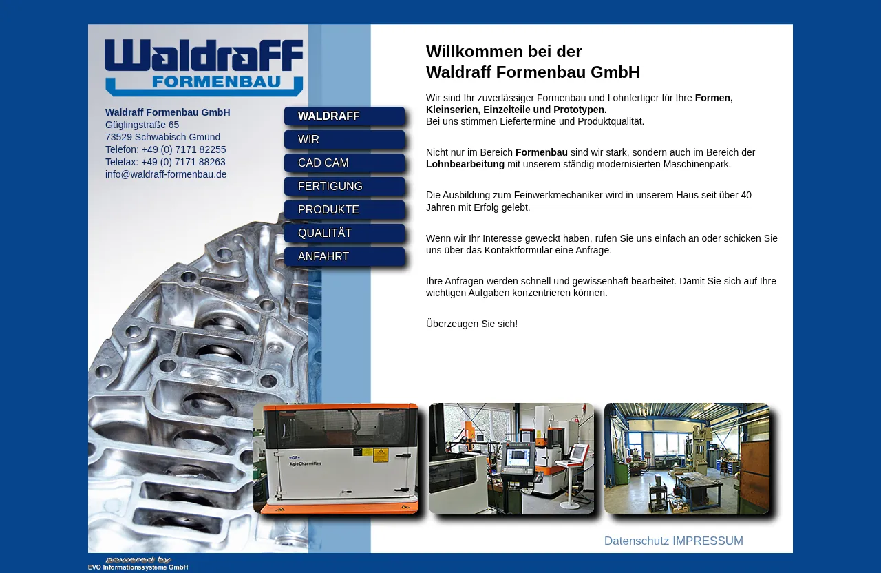 Waldraff Formenbau GmbH is a specialized provider of mold making and contract manufacturing services based in Schwäbisch Gmünd, Germany. The company produces molds, small-batch runs, individual components, and prototypes to precise technical specifications. With a legacy of over 40 years in precision mechanical engineering and vocational training, they emphasize a commitment to high product quality and reliable delivery timelines. Their facility utilizes modern machinery to maintain high standards across all manufacturing processes. Clients receive dedicated support throughout the project inquiry and production lifecycle.