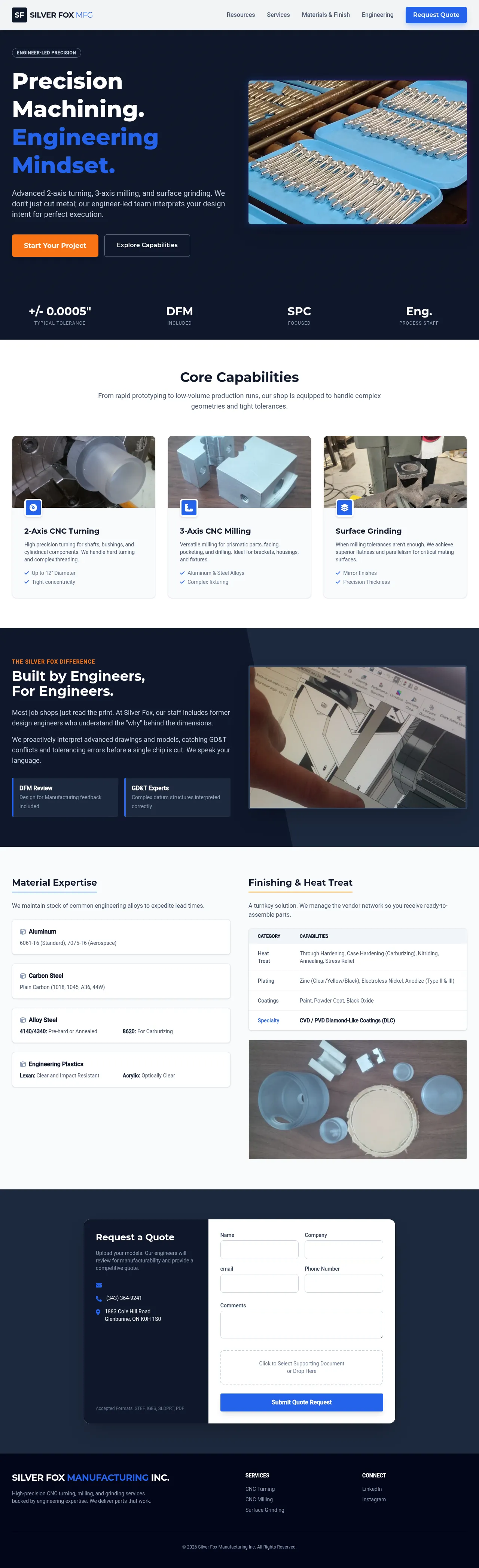 Silver Fox Manufacturing provides precision machining services, including CNC turning, milling, and surface grinding. The company focuses on supporting design engineers by offering professional manufacturability reviews and turnkey project management for custom machinery components. They specialize in handling complex geometries and tight-tolerance parts for industries requiring high-quality mechanical hardware. In addition to machining, the shop offers integrated heat treatment, plating, and finishing services. By leveraging an engineering-led approach, the team assists clients in optimizing design choices for material selection, durability, and cost-effectiveness.