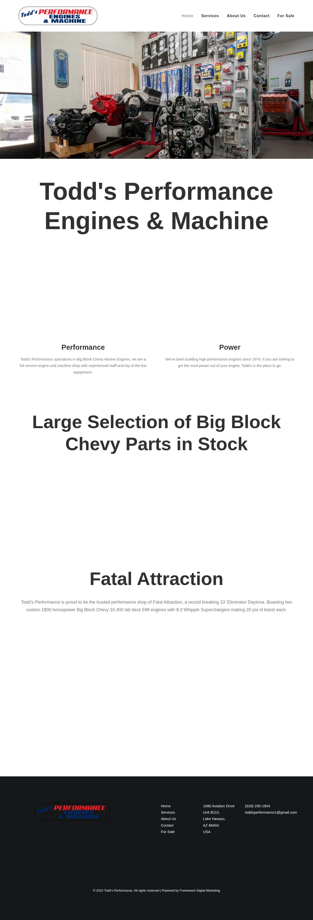 Todd's Performance is a full-service engine and machine shop based in Lake Havasu City, Arizona, specializing in high-performance marine engines. Established in 1979, the company focuses on the precision assembly and machining of Big Block Chevy marine powerplants for high-performance boating applications. The facility features an in-house machine shop and a state-of-the-art clean room environment to ensure expert engine precision. With over four decades of industry experience, the technical staff provides comprehensive engine services ranging from block machining and balancing to cylinder head preparation. The firm is recognized for its ability to deliver high-output performance engines built to exact specifications.