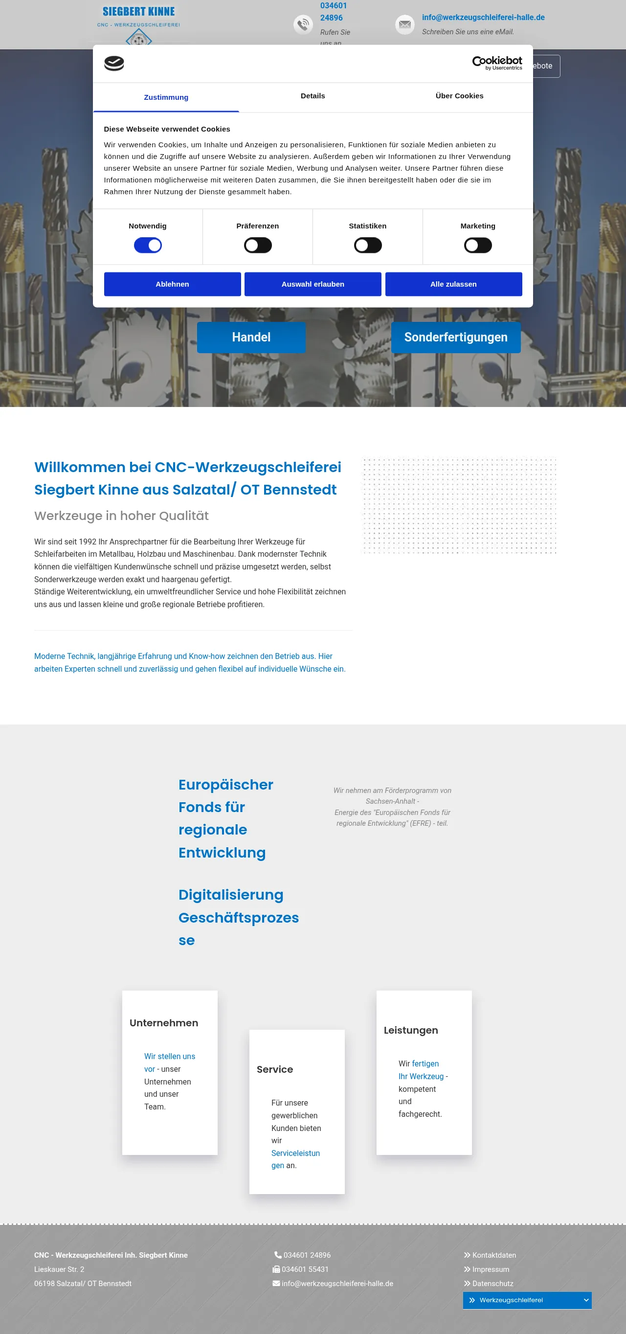CNC-Werkzeugschleiferei Siegbert Kinne is an industrial service provider based in Salzatal, Germany, specializing in precision tool grinding and manufacturing. Established in 1992, the company serves the metalworking, woodworking, and mechanical engineering sectors with custom tool production and maintenance. Utilizing advanced CNC technology, the firm delivers high-precision solutions for both standard and specialized tooling requirements. The company emphasizes high flexibility, environmental responsibility, and professional expertise to support regional operations. Its team provides reliable service and rapid response times for complex client specifications.