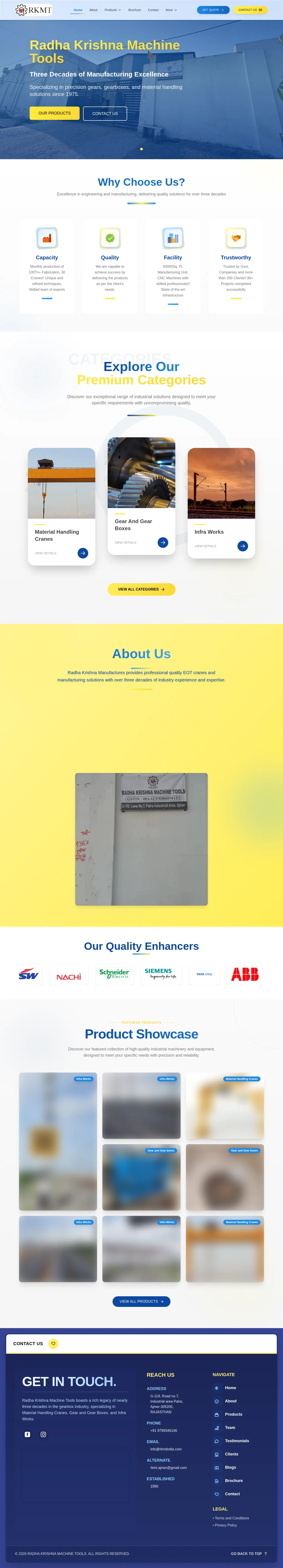 Radha Krishna Machine Tools manufactures gears, gearboxes and material handling equipment for industrial and infrastructure applications. The company supplies material handling cranes, precision gears and packaged gearboxes, and undertakes related infrastructure work. It operates a 50,000 sq. ft. manufacturing facility equipped with CNC machines and fabrication capabilities. The company has served industrial clients since 1975.