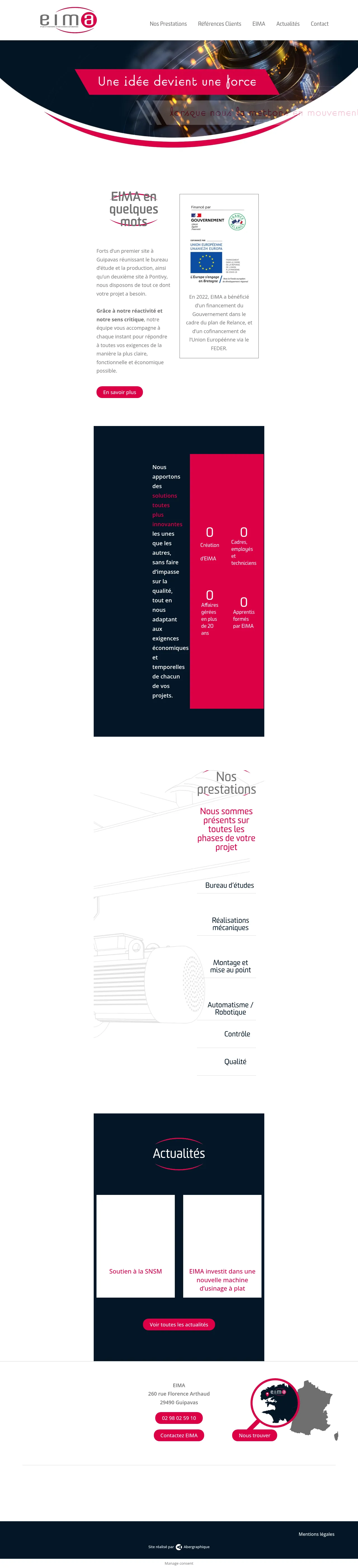 EIMA is a Bretagne-based industrial engineering firm specializing in the design and production of special-purpose machinery, machining, and boilermaking services. The company provides end-to-end project support, spanning from initial mechanical design and automation development to final assembly, testing, and commissioning. Serving sectors including defense, oceanography, automotive, and agri-food, EIMA utilizes advanced CAD software and precision metrology to ensure high-quality standards. Their facilities are equipped with versatile fabrication machinery and robotic production lines, allowing them to handle complex mechanical assemblies and customized industrial prototypes. EIMA emphasizes responsiveness and economic efficiency, delivering robust, certified solutions tailored to specific client requirements.