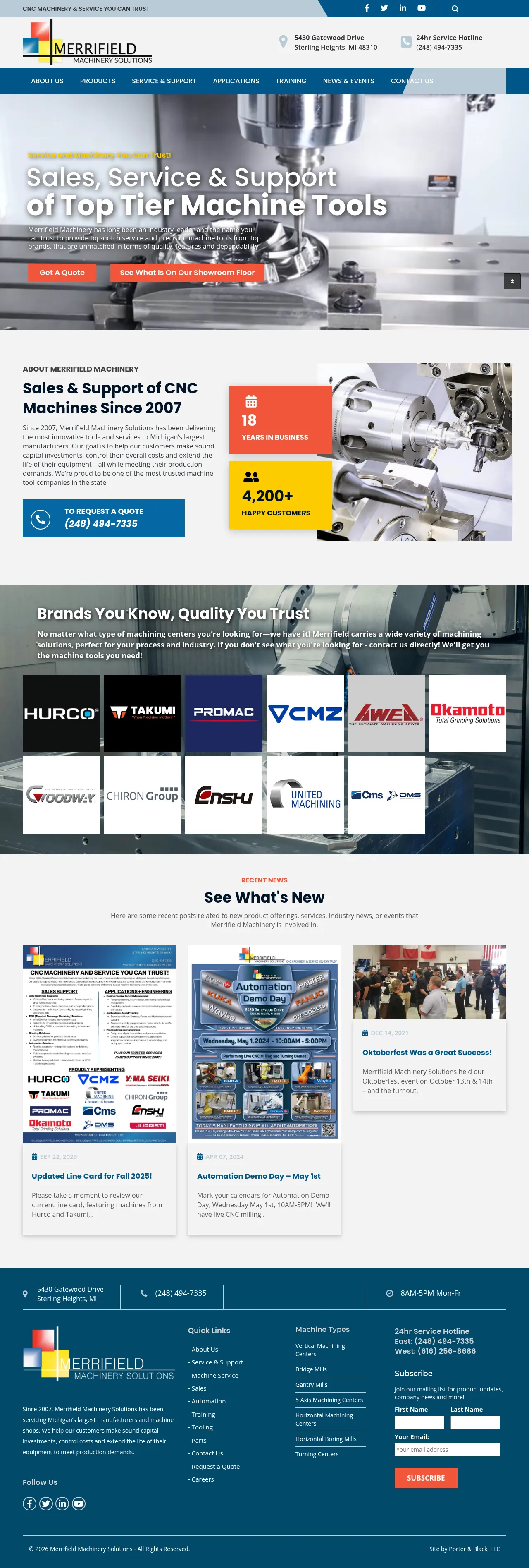 Merrifield Machinery Solutions is a provider of industrial machine tools and turnkey services for manufacturers and machine shops. Established in 2007, the company specializes in the distribution of CNC machining centers, turning centers, and robotics. They offer comprehensive technical support, onsite maintenance, and machine tool training programs for operators. The company focuses on helping clients optimize capital investments, minimize downtime, and extend equipment lifecycles. Their operations serve as a resource for high-performance machining technology and industrial automation solutions.