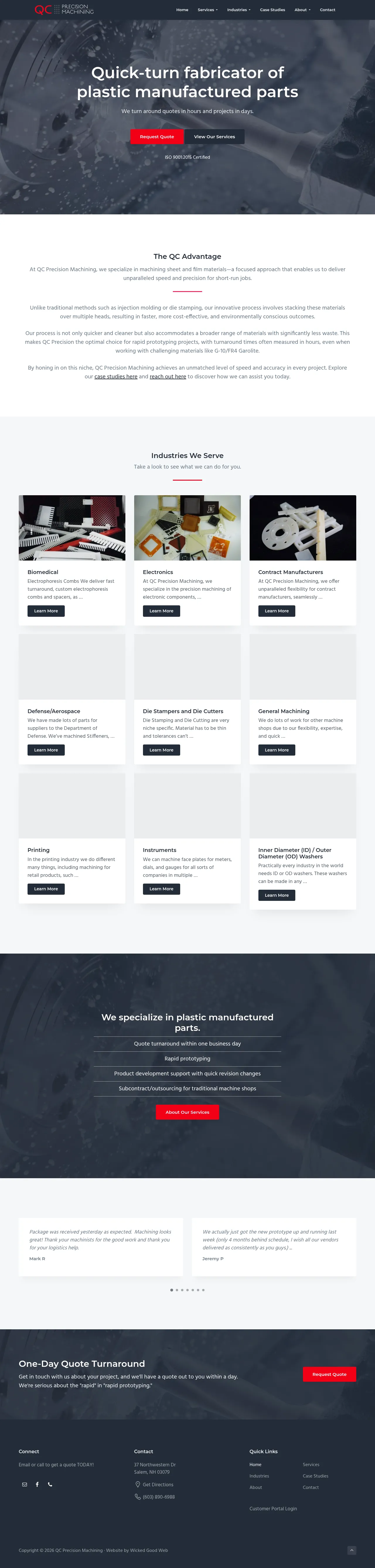 QC Precision Machining is an ISO 9001:2015 certified manufacturer specializing in the rapid machining of plastic sheet and film materials. Utilizing a multi-head machine process, the company provides high-speed production for short-run jobs, prototypes, and custom components across industries such as aerospace, defense, electronics, and biomedical. Their operational model prioritizes rapid turnaround times, often delivering quotes within one business day and project completion within days. The company maintains a paperless workflow and customer portal, offering transparency in order status and project history. They offer advanced plastic fabrication services as an efficient alternative to traditional injection molding or die cutting methods.