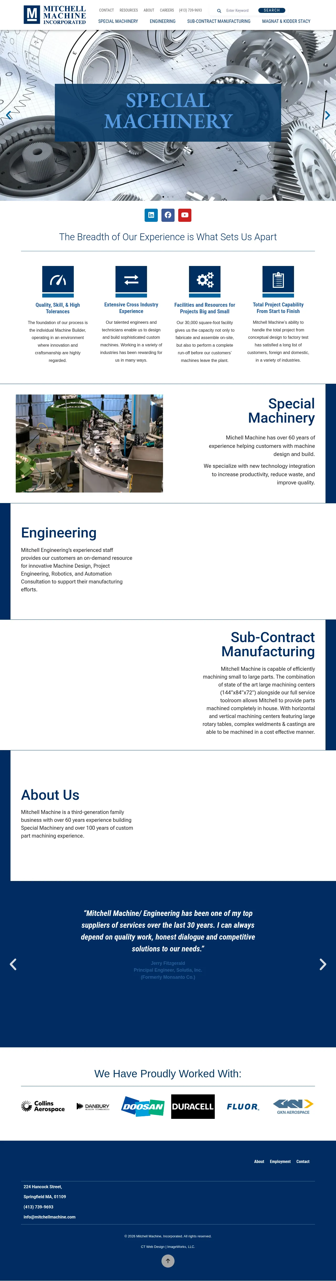 Mitchell Machine is a third-generation, family-owned engineering and manufacturing firm with over 60 years of experience in special machinery design and custom part production. Operating out of a 30,000-square-foot facility in Springfield, Massachusetts, the company provides end-to-end project management from conceptual design through assembly and factory run-off. Their capabilities encompass robotics integration, automated machining, controls engineering, and precision fabrication for a diverse range of industries. By prioritizing innovation and craftsmanship, the company focuses on helping clients improve manufacturing productivity, reduce waste, and enhance product quality. They maintain a versatile infrastructure capable of handling both complex custom machine builds and specialized contract manufacturing requirements.