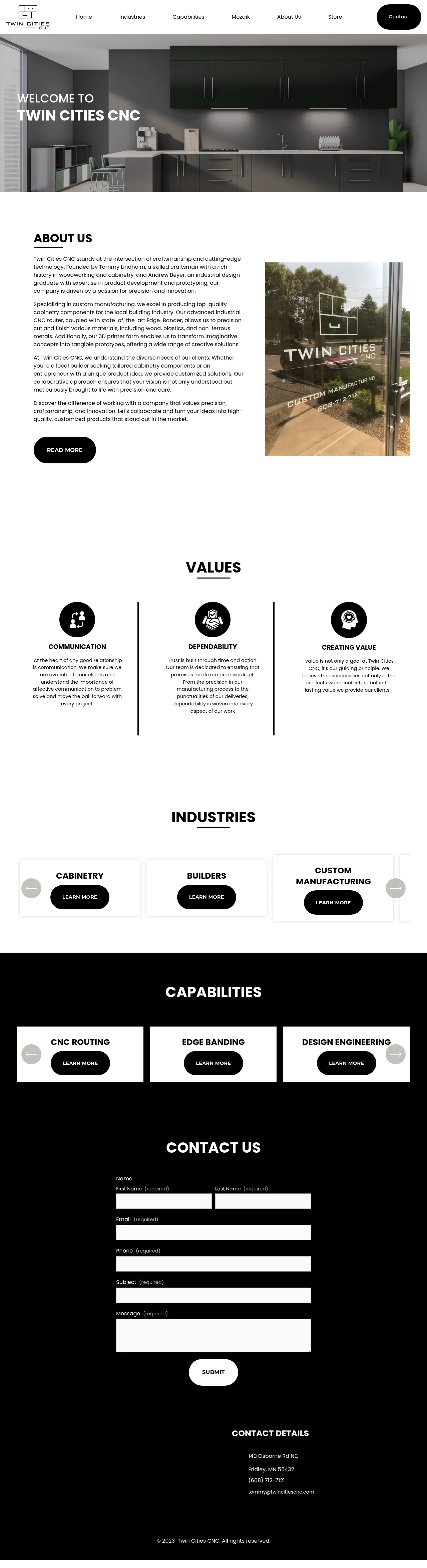Twin Cities CNC manufactures cabinetry components and related parts for the building industry using CNC-based production methods. The company operates an industrial CNC router and an edge-banding system to precision-cut and finish wood, plastics, and non-ferrous metals. It also maintains a 3D printer farm for prototyping and supports cabinet design through Mozaik Cabinetry software.