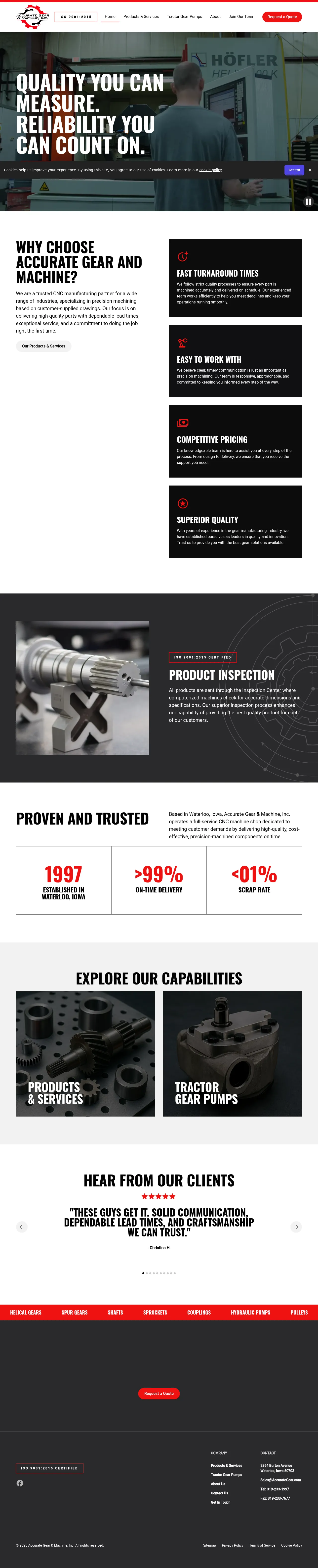 Accurate Gear And Machine, Inc. is a Waterloo, Iowa-based manufacturing firm specializing in precision machining and custom gear production. The company serves a diverse range of industrial sectors by producing high-quality components from customer-supplied drawings or reverse-engineered samples. Their technical capabilities include CNC milling, robotic turning, advanced gear cutting, and grinding, supported by rigorous CMM inspection processes. By maintaining a focus on clear communication and dependable lead times, the firm provides both prototype and full-scale production solutions. Their commitment to operational excellence is supported by consistent on-time delivery and high craftsmanship standards.