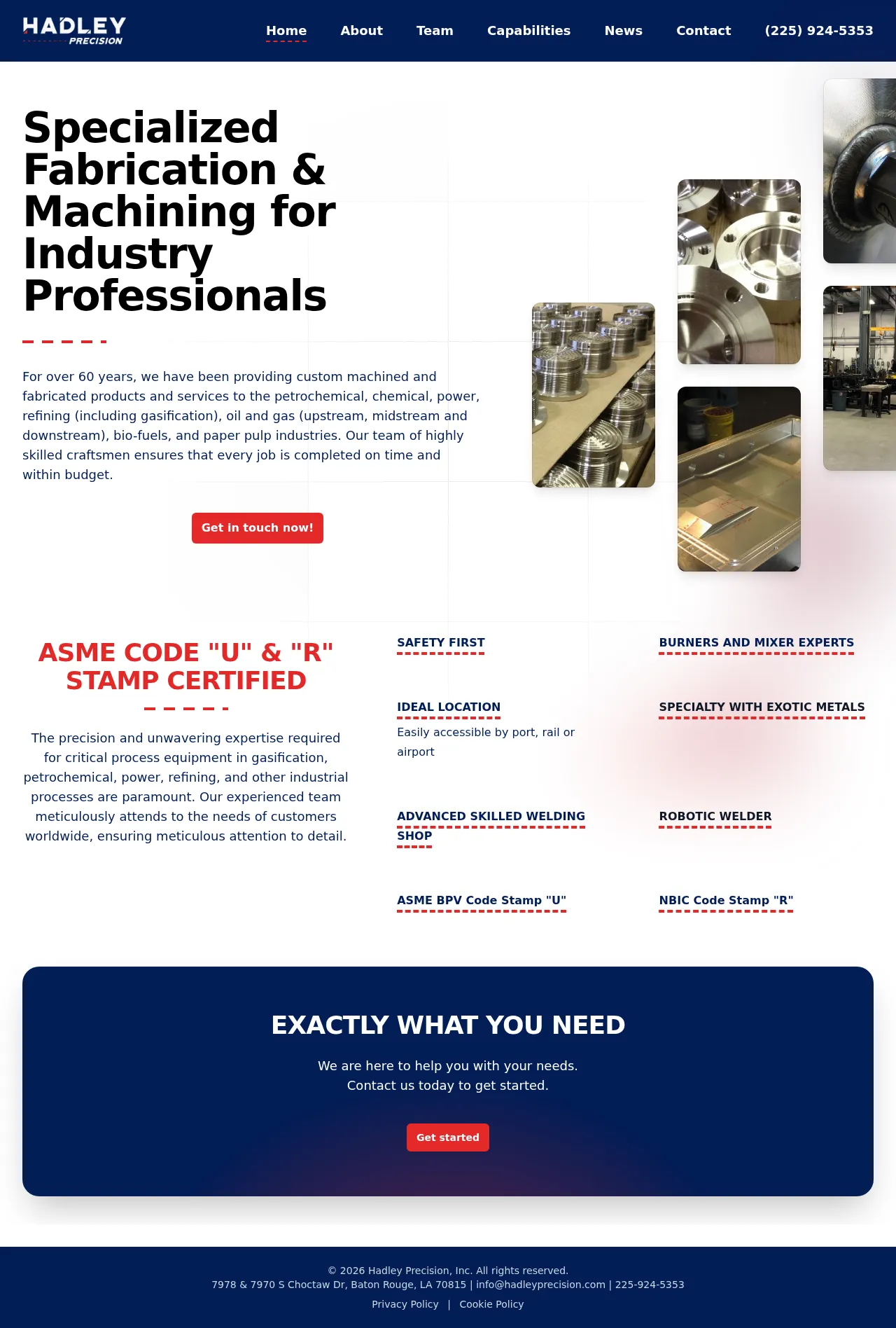 Hadley Precision is a specialized manufacturer providing high-quality critical process equipment for the gasification, petrochemical, power, and refining industries. With over 60 years of experience, the company operates a 35,000-square-foot facility located in Baton Rouge, Louisiana. They maintain advanced welding and fabrication capabilities, including specialized work with exotic metals. The company is a certified veteran-owned business known for its commitment to safety and technical precision. Their strategic location near the Mississippi River allows for convenient logistical access via port, rail, and airport.