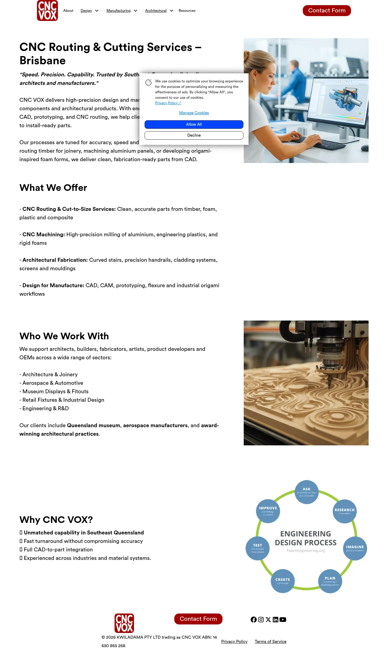 CNC VOX provides precision CNC routing, machining and architectural fabrication services. The company offers end-to-end CAD/CAM and prototyping workflows to produce install-ready components from CAD. It works with timber, foams, plastics and aluminum to deliver parts for joinery, architectural elements and bespoke fabrication projects.