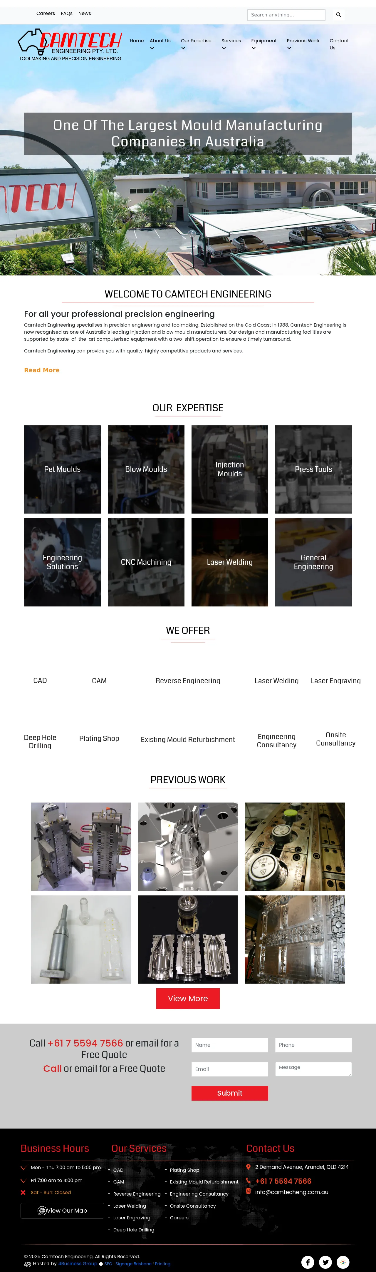 Camtech Engineering is a precision engineering and toolmaking company based on the Gold Coast, established in 1988. It specialises in injection and blow mould design and manufacture and operates computerised design and production facilities. The business runs a two‑shift operation to support timely turnaround and provides mould refurbishment and engineering consultancy services.