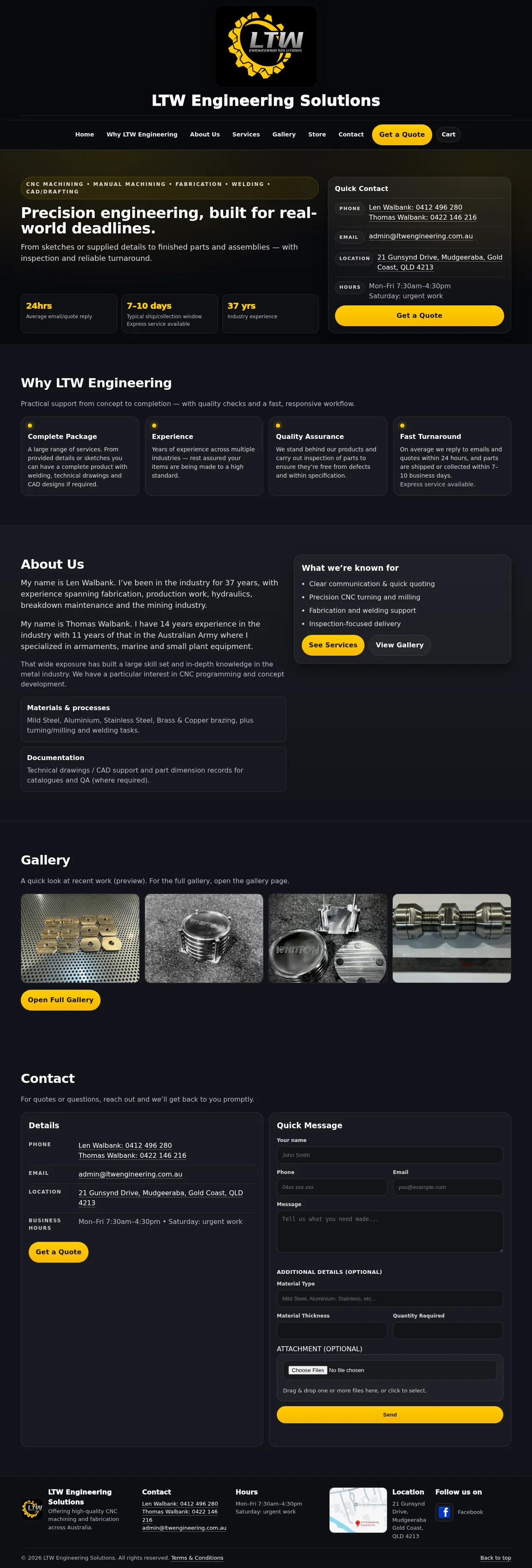 LTW Engineering Solutions is a Gold Coast-based engineering workshop specialising in CNC machining and metal fabrication. The company produces precision turned and milled components, performs manual machining, welding and assembly, and provides CAD/drafting and technical drawing support. LTW offers inspection and part-dimension records for quality assurance and serves clients across multiple industries with an emphasis on reliable turnaround.