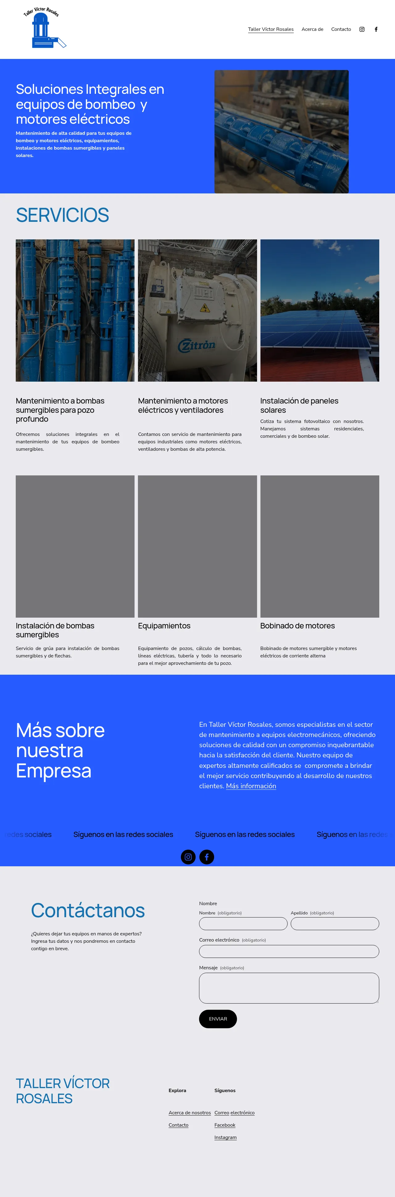 Taller Víctor Rosales specializes in comprehensive maintenance and installation solutions for electromechanical equipment, including high-power motors and submersible pumps. The company provides a wide array of industrial services such as deep-well pump maintenance, electric motor rewinding, and ventilation system servicing. In addition to core mechanical repairs, they design and install photovoltaic systems for residential, commercial, and solar pumping applications. The firm manages complete well-equipping projects, including technical calculations, electrical line installation, and piping integration. Their team of qualified experts serves industrial clients with a focus on operational reliability and infrastructure development.