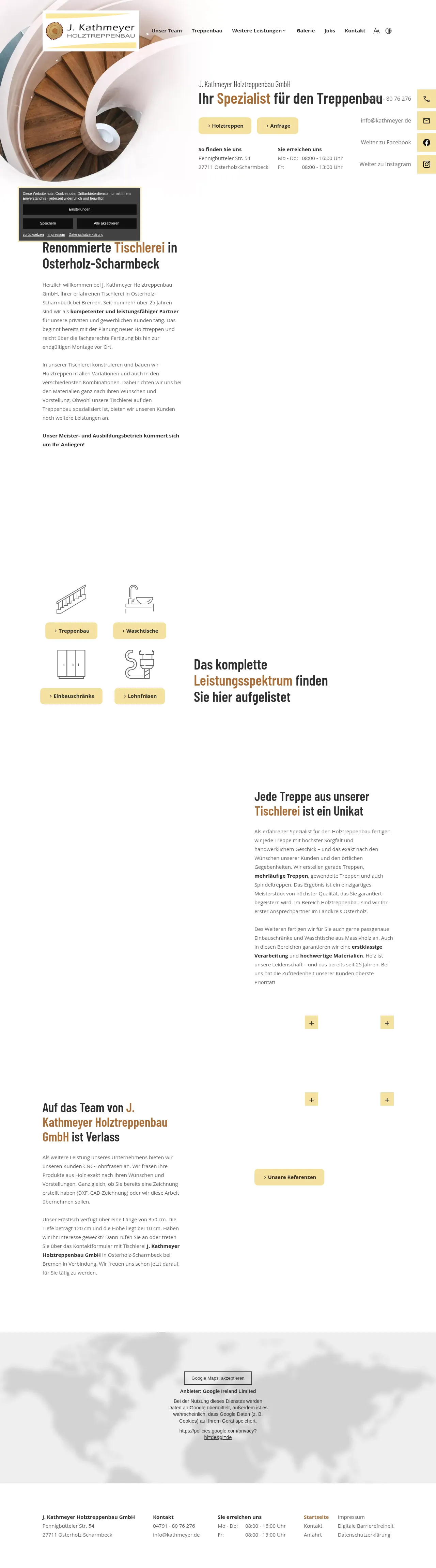J. Kathmeyer Holztreppenbau GmbH is a specialized woodworking company based in Osterholz-Scharmbeck, Germany, with over 25 years of experience. The firm focuses on the design, manufacturing, and installation of custom wooden staircases, including straight, winding, and spiral variations. In addition to staircase production, the company provides bespoke furniture construction, such as custom vanity units and cabinetry tailored to specific architectural spaces. They also offer contract CNC milling services for wood products to both private and commercial clients. The company emphasizes high-quality craftsmanship, providing 3D planning support and professional on-site installation for all projects.