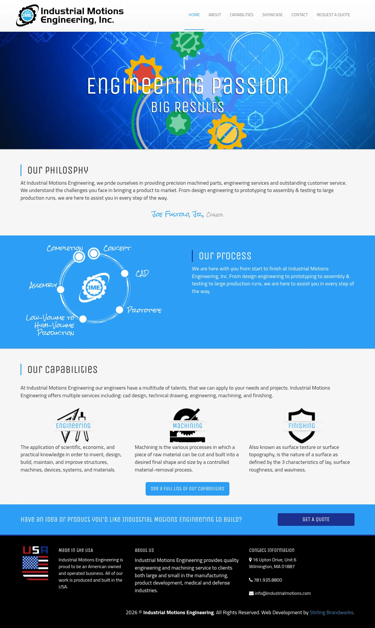 Industrial Motions Engineering is a US-based manufacturer offering comprehensive engineering, machining, and finishing services. The company specializes in CAD/CAM design, prototyping, and the construction of complex mechanical assemblies for the manufacturing, medical, and defense industries. With an "under-one-roof" facility in Wilmington, Massachusetts, they provide agile solutions ranging from short-run production to custom machine development. Their capabilities include precision CNC machining, reverse engineering, and various surface treatments to support product development from initial concept to final production. They are distinguished by their ability to provide rapid design-to-build timelines and technical expertise in electro-mechanical systems.