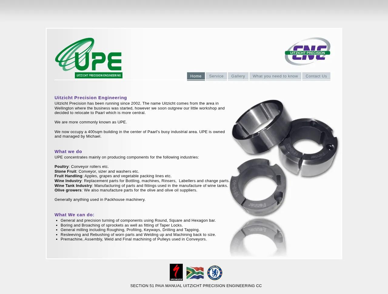 Established in 2002, Uitzicht Precision Engineering operates from a 400-square-meter facility in Paarl, South Africa. The company specializes in precision CNC milling and turning services, catering primarily to the agricultural, packaging, and wine production industries. Their core competencies include component manufacturing, sprocket boring and broaching, as well as the repair and reconditioning of worn mechanical parts. UPE provides comprehensive support from pre-machining and assembly to final fabrication for various conveyor systems and industrial machinery. The firm maintains a focus on delivering engineered solutions tailored to the operational requirements of fruit, poultry, and olive processing sectors.