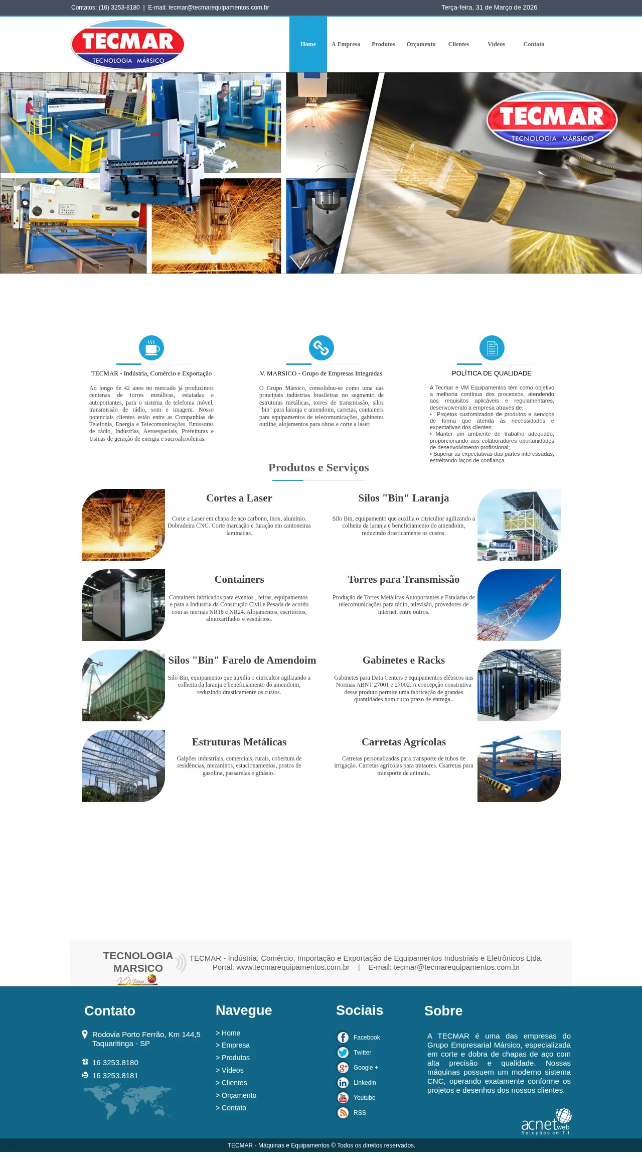 Tecmar Equipamentos, part of the Grupo Mársico, is a Brazilian manufacturer specializing in high-precision metal structures and industrial equipment. The company produces a diverse range of products including telecommunications towers, agricultural trailers, silos for peanut and citrus processing, containers, and data center cabinets. Their manufacturing facility utilizes advanced CNC technology to provide high-quality laser cutting, bending, and punching services. Serving sectors such as telecommunications, energy, and agriculture, they emphasize continuous process improvement and quality adherence. With over four decades of experience, Tecmar supports clients through both standardized production and customized metal fabrication solutions.