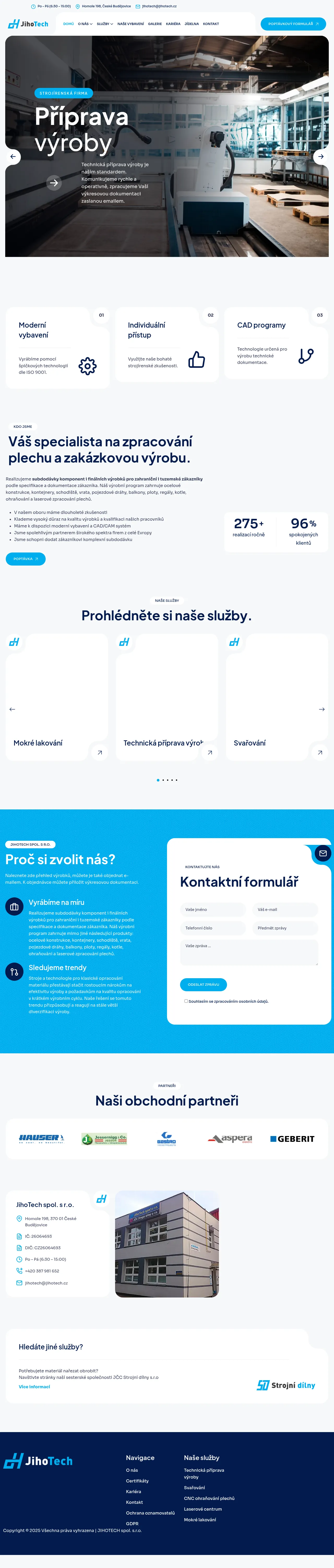 JihoTech spol. s r.o. is a Czech-based manufacturing company specializing in precision metal fabrication, machining, and engineering services. Established in 2003, the company provides comprehensive solutions for custom and serial production of components and final assemblies for customers across Europe. Their core competencies include advanced laser cutting, CNC bending, and high-quality welding of various metal structures. The company utilizes CAD/CAM systems to support technical production planning and ensures all processes meet rigorous international quality standards. They focus on delivering tailor-made industrial solutions, ranging from steel constructions and containers to architectural metalwork and technical equipment.