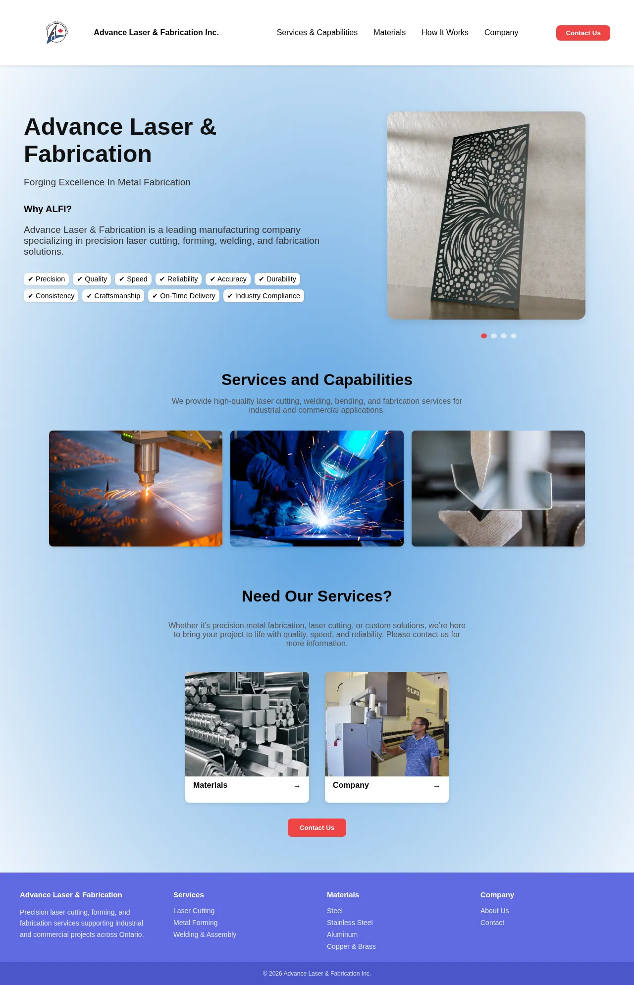 ALFI is a metal fabrication specialist based in Ontario, providing high-precision services for industrial and commercial sectors. The company offers a comprehensive range of capabilities, including advanced laser cutting, metal forming, welding, and structural fabrication. Focused on reliability and efficiency, ALFI supports projects from initial custom design through to final production. Their operations are geared toward delivering high-quality metal solutions tailored to complex project requirements. The company emphasizes a commitment to precision and speed in all fabrication workflows.