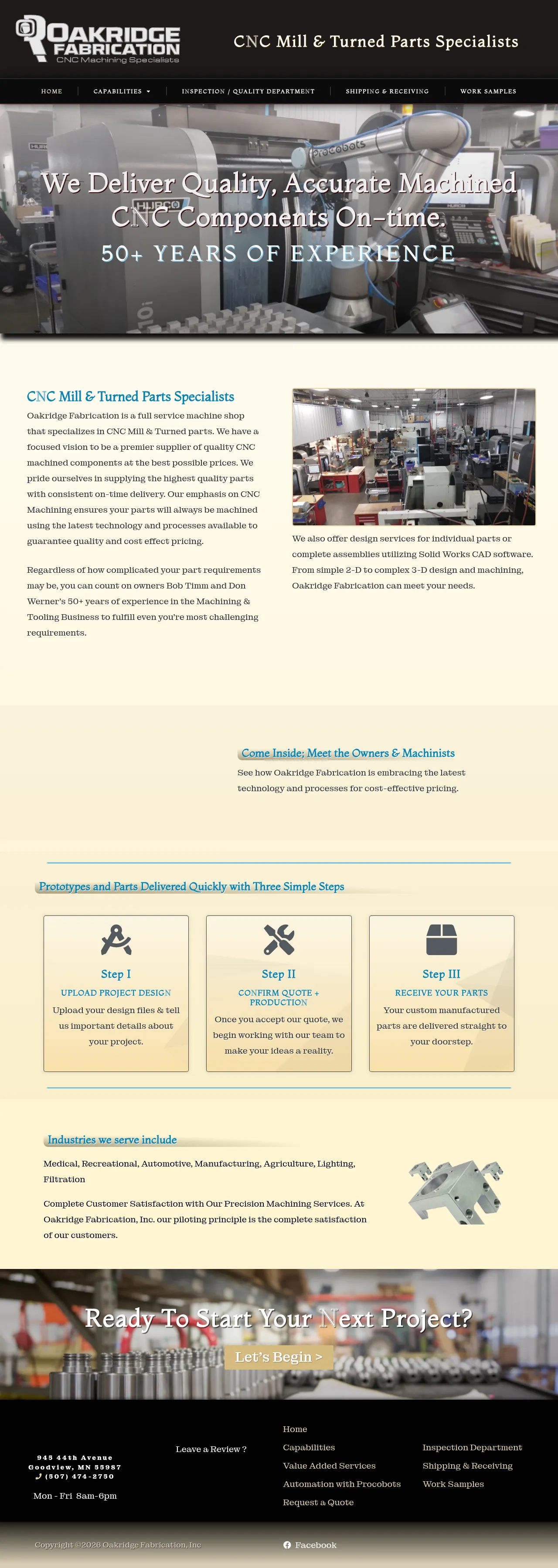 Oakridge Fabrication, Inc. is a precision machining company specializing in CNC-machined components and complete assemblies. They serve a broad range of sectors including medical, automotive, manufacturing, agriculture, lighting, and filtration. The company utilizes CAD-based design services to support prototyping through high-volume production. Their facility includes comprehensive in-house inspection, automated machine tending, and material inventory management to ensure on-time delivery. Oakridge emphasizes strict adherence to print specifications through a multi-stage quality assurance process.