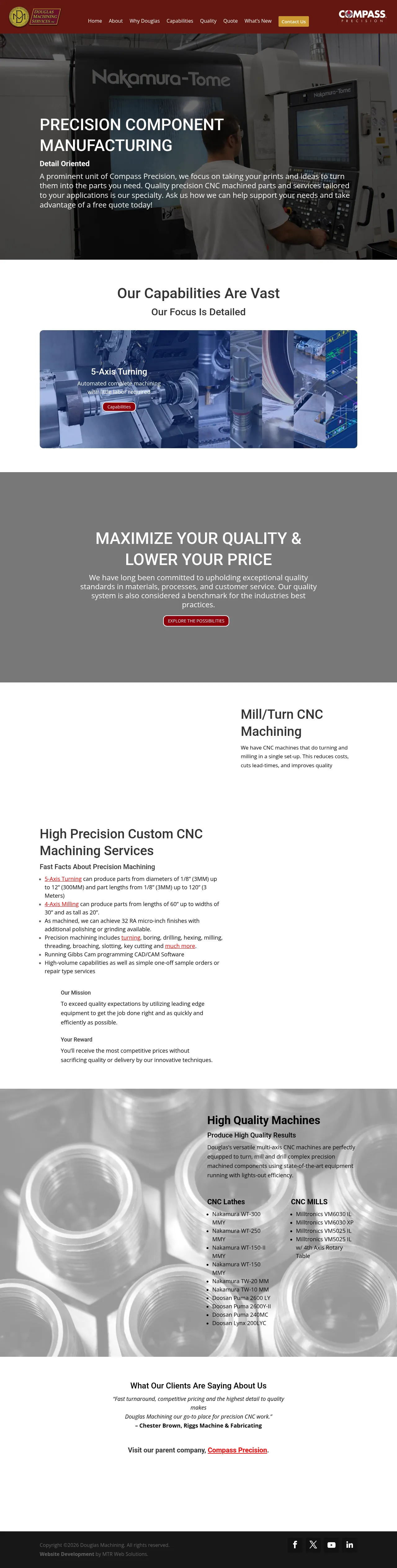 Douglas Precision Machining, a member of Compass Precision, specializes in custom high-precision CNC manufacturing services. The company provides comprehensive machining solutions, including turning, milling, and complex multi-axis fabrication for various industrial applications. Their technical capabilities span from prototyping and single-part production to high-volume manufacturing, supported by advanced EDM and reverse engineering services. By utilizing modern CAD/CAM software and automated equipment, the firm maintains high quality standards and operational efficiency for complex components. The facility is equipped to handle diverse project requirements ranging from repair and refurbishment to complete die making.