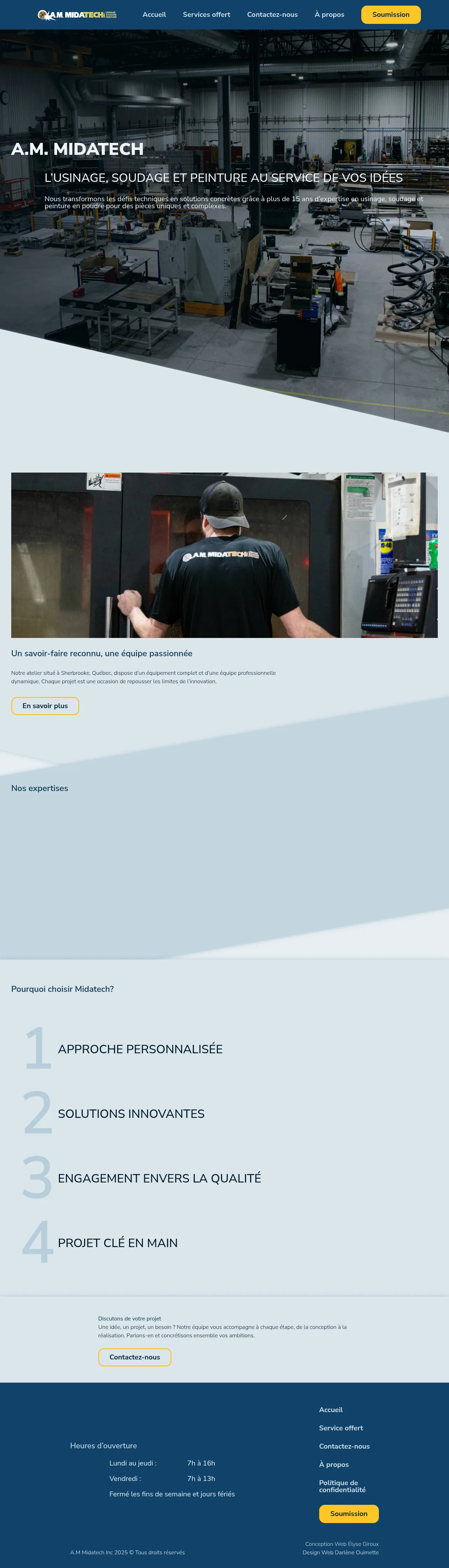A.M. Midatech is a manufacturing facility based in Sherbrooke, Quebec, specializing in machining, welding, and powder coating services. The company provides comprehensive support for the production of unique and complex components, offering end-to-end project management from initial design to final realization. With over 15 years of experience, the team serves a diverse client base requiring high-precision fabrication and custom metalwork. They emphasize a personalized approach, ensuring technical challenges are met with innovative solutions and rigorous quality standards.