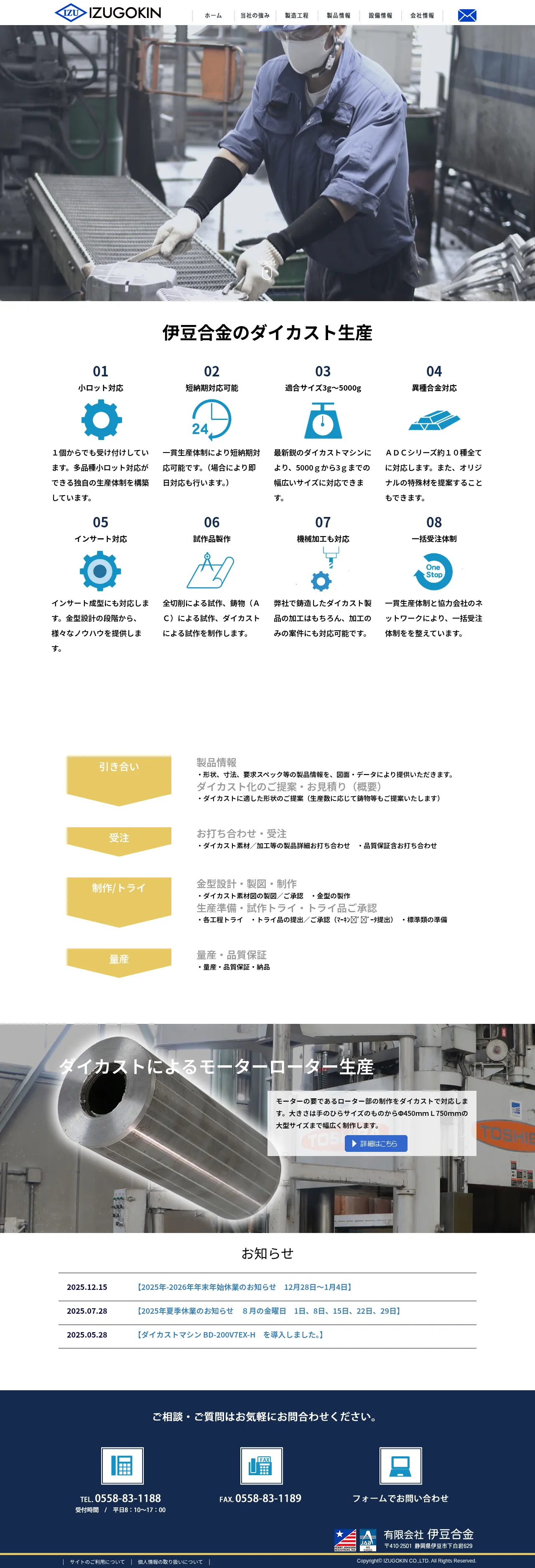 Izu Gokkin is a specialized die-casting manufacturer based in Shizuoka, Japan, focusing on high-mix, low-volume production. The company provides integrated manufacturing solutions ranging from prototype development to full-scale production, accommodating part sizes from 3g to 5000g. Their service portfolio includes die casting, precision machining, insert molding, and the production of large-scale motor rotors. By utilizing a robust network of partners and a flexible production system, the company supports short lead times and can facilitate orders starting from a single unit. They are experienced in working with a wide range of aluminum alloys and offer custom material consultations to meet specific client requirements.