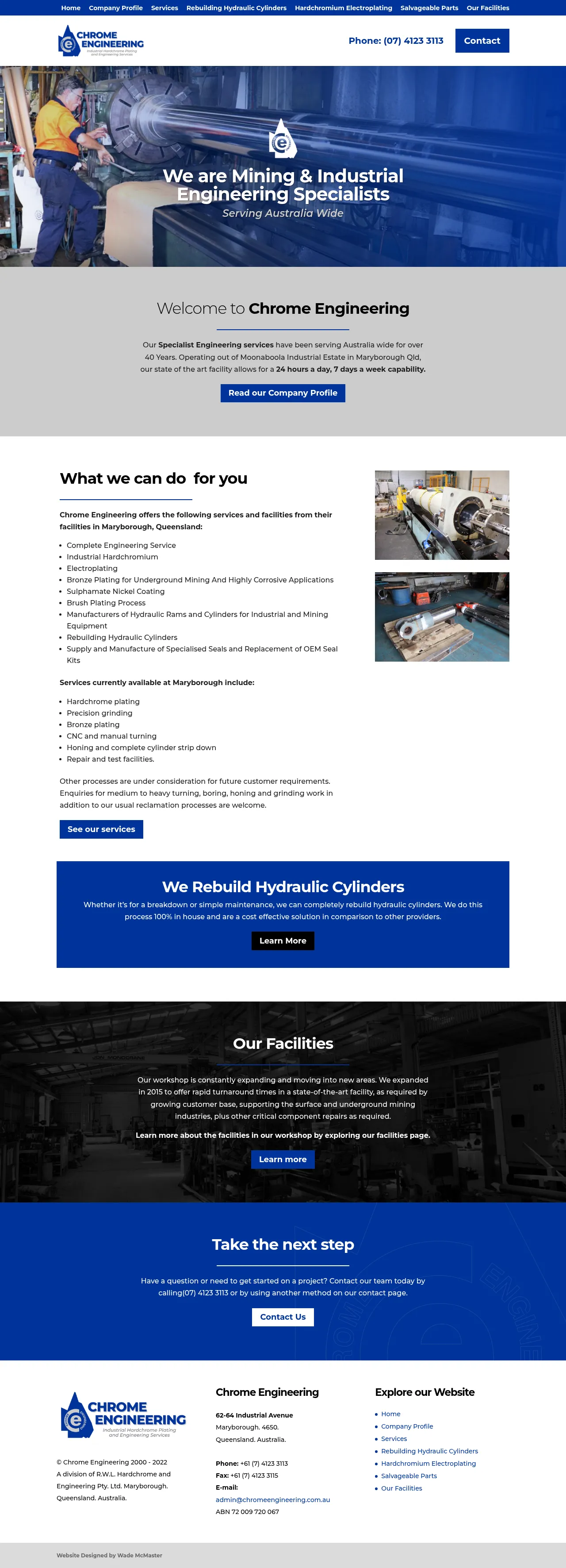 Chrome Engineering is a specialized manufacturer and service provider for industrial and mining equipment, operating out of Maryborough, Queensland. The company specializes in hardchromium electroplating, hydraulic cylinder rebuilding, and precision machining, serving sectors such as mining, transport, and heavy earthmoving. Their comprehensive in-house capabilities include large-scale turning, honing, and grinding, alongside the supply of specialized seals and OEM kits. With an extensive range of CNC and manual machinery, they focus on reclaiming worn or damaged components to improve durability and performance. The company provides a complete end-to-end service, from initial inspection and refurbishment to final testing and painting.