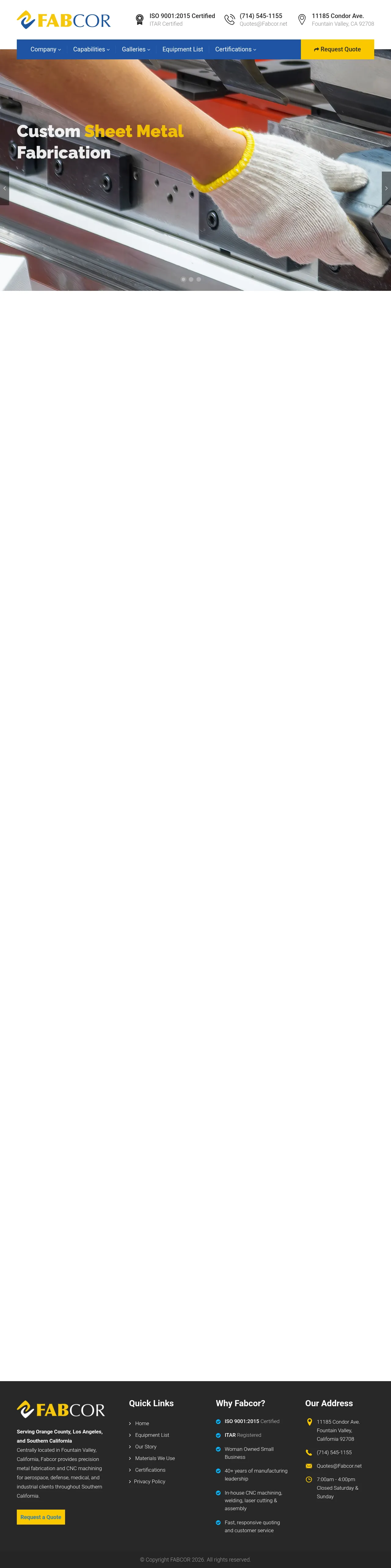 Fabcor is a Southern California-based manufacturer specializing in precision CNC machining, sheet metal fabrication, and certified welding services. Serving clients in the aerospace, defense, medical, pharmaceutical, and entertainment sectors, the company provides both prototype and production runs. Their facility is equipped to handle complex assemblies, hardware installation, and custom stainless steel fabrication to meet tight tolerances. As a woman-owned small business, Fabcor prioritizes responsiveness and quality, maintaining rigorous compliance with industry standards for government and commercial aviation programs. The company offers turnkey manufacturing solutions, supporting projects from initial design through final finishing.