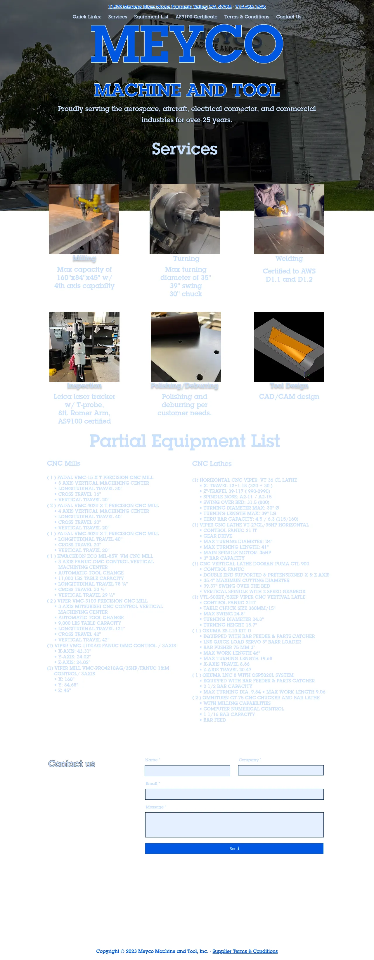 Meyco Machine and Tool, Inc. is a precision manufacturing facility with over 25 years of experience supporting the aerospace, aircraft, electrical connector, and commercial sectors. The company specializes in comprehensive CNC machining services including milling, turning, and tool design. Their facility is equipped to handle complex projects, utilizing advanced inspection technology and CAD/CAM software to ensure high precision. Committed to quality standards, they provide a range of secondary services such as welding, polishing, and deburring to deliver finished components. Meyco Machine and Tool maintains rigorous operational standards to meet the diverse technical requirements of their industrial clientele.