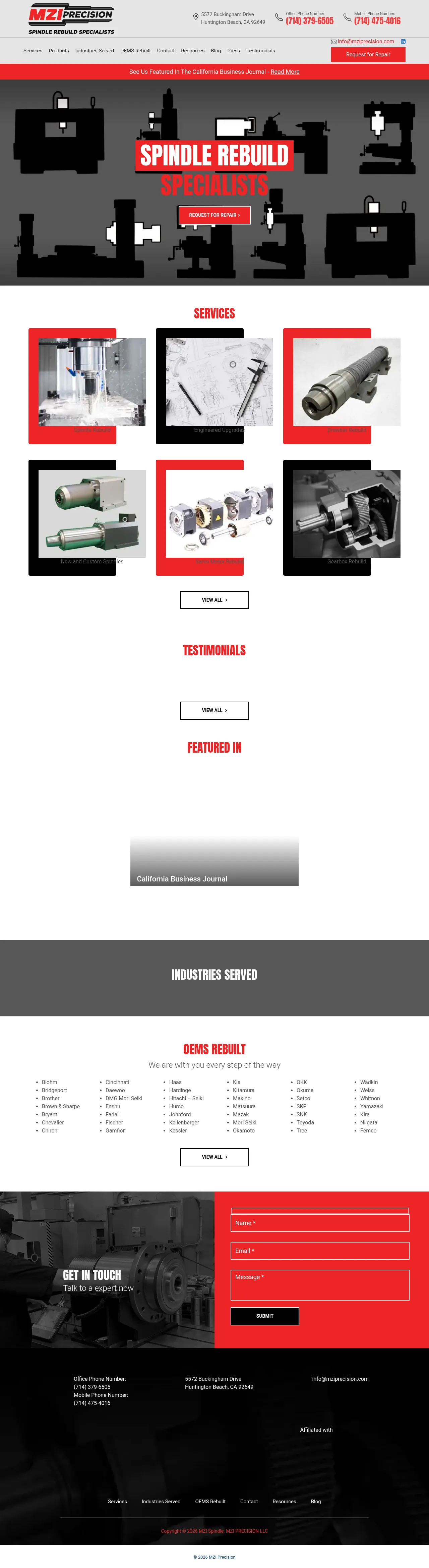 MZI Precision is a specialized service provider focusing on the repair, rebuild, and maintenance of industrial spindles and motors. The company supports a diverse range of sectors including aerospace, automotive, medical, and renewable energy by providing technical diagnostic, refurbishment, and re-engineering services. Their technical capabilities include drawbar repair, spindle motor rebuilding, gearbox maintenance, and the creation of custom spindle units. Operating out of Huntington Beach, California, MZI Precision emphasizes rapid turnaround times and on-site testing for machine tool spindles. Their team is equipped to handle complex repairs across various major machine tool brands to ensure optimal performance and operational longevity.