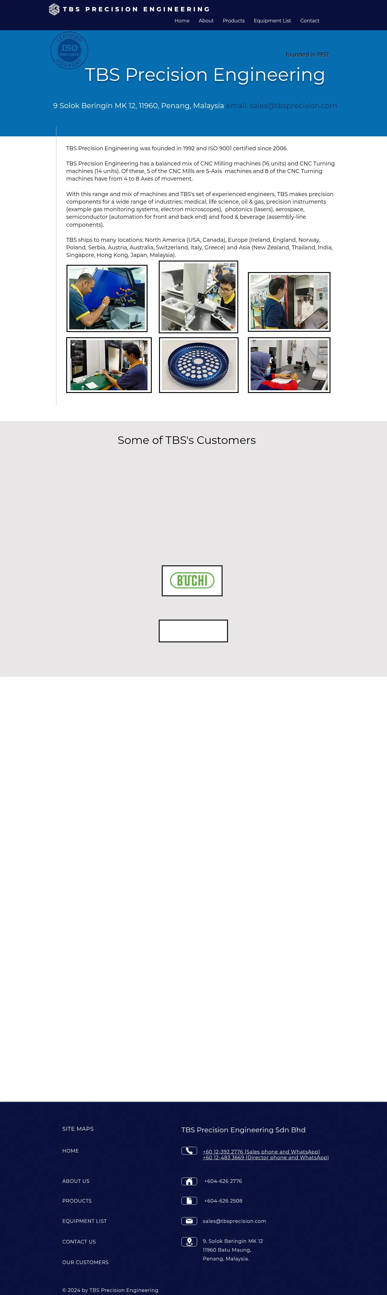 TBS Precision Engineering Sdn Bhd is a precision machining company based in Batu Maung, Penang, Malaysia. Founded in 1992, the company produces precision metal and plastic components for a range of sectors including medical, life sciences, instruments, aerospace, oil & gas, automation, photonics, semiconductor and food & beverage. TBS operates diverse CNC capabilities including milling, turning, multi-axis machining, turn-mills and automatic lathes. The company is certified to ISO 9001:2015.