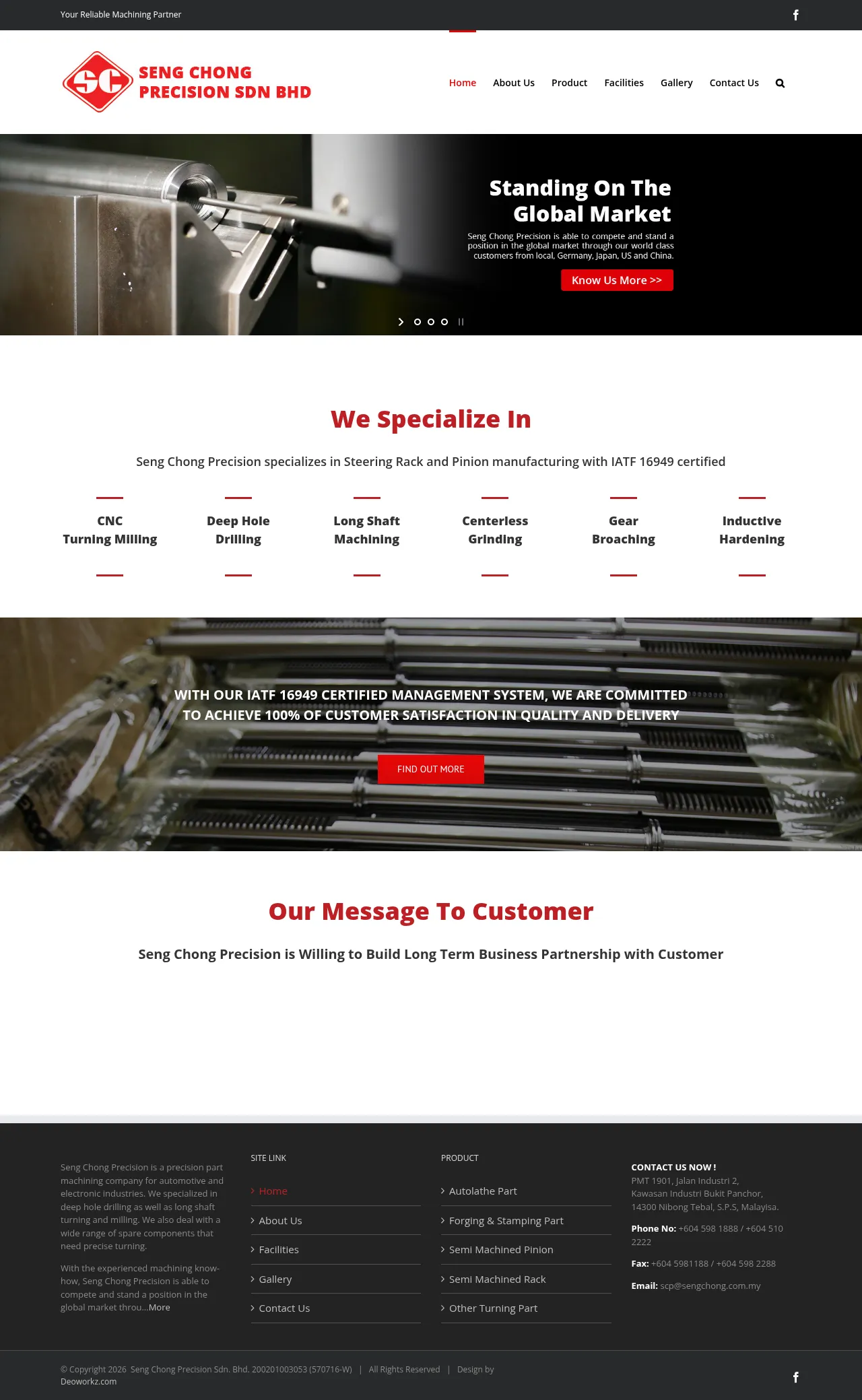 Seng Chong Precision Sdn. Bhd. is a precision machining company established in 1990 that supplies components for the automotive and electronics sectors. The company specializes in deep hole drilling, long-shaft turning, and CNC milling and turning, and manufactures steering rack and pinion assemblies. It operates a roughly 100,000 sq ft facility with over 100 machines and about 250 employees. Seng Chong produces precision spare components for both local and international customers.