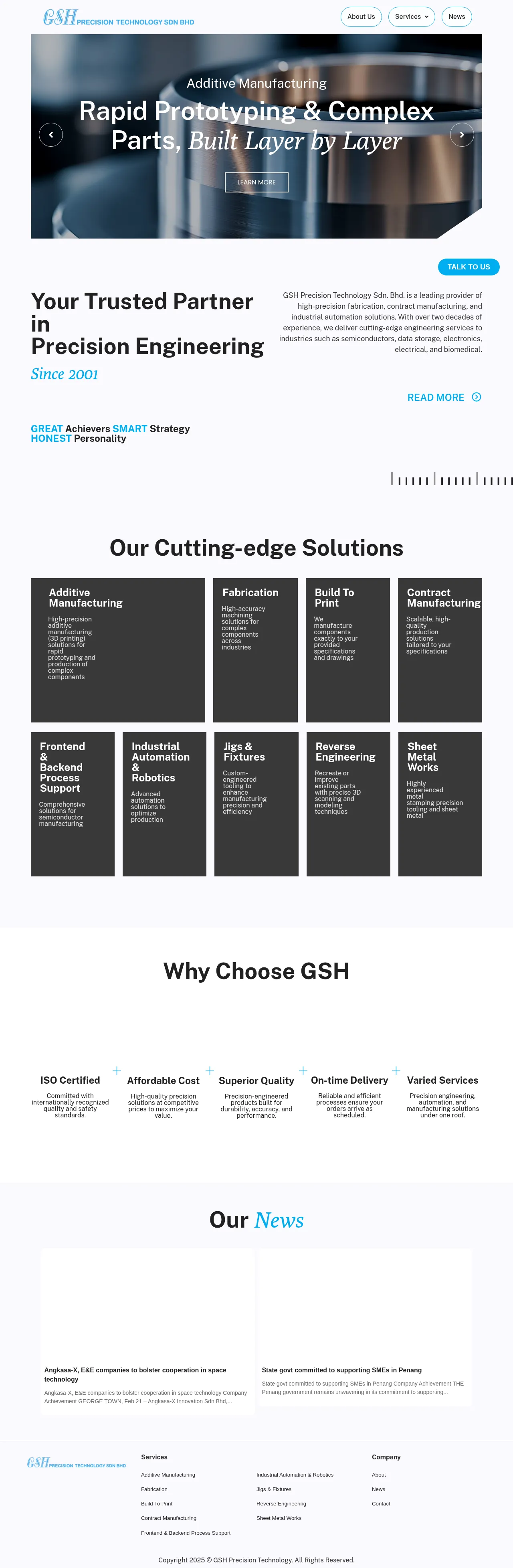 GSH Precision Technology Sdn. Bhd. provides high-precision fabrication, contract manufacturing, and industrial automation solutions. With over two decades of experience, the company serves customers in the semiconductor, data storage, electronics, electrical, and biomedical industries. Its capabilities include additive manufacturing and rapid prototyping, precision machining and injection molding, and integrated PLC/robotics systems with IoT/Industry 4.0 connectivity.