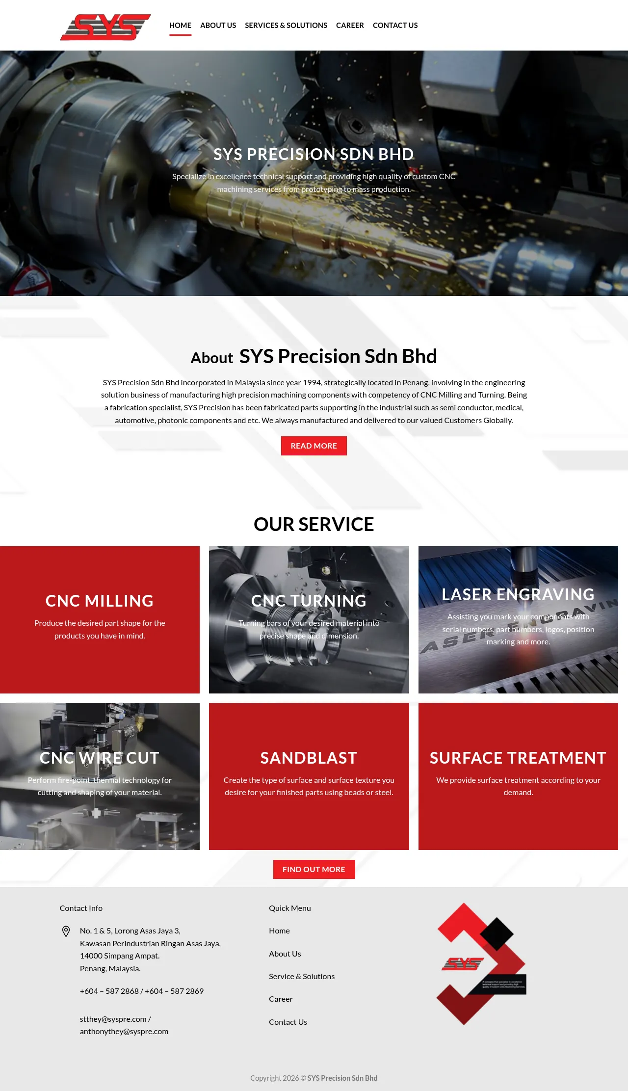 SYS Precision Sdn Bhd, established in 1994 and based in Penang, Malaysia, manufactures high‑precision machined components using CNC milling and turning. The company supplies fabricated parts for the semiconductor, medical, automotive, photonics and other industrial sectors, supporting projects from prototyping to volume production. Ancillary capabilities include laser engraving, wire cutting, sandblasting and a range of surface treatments to meet customer specifications.