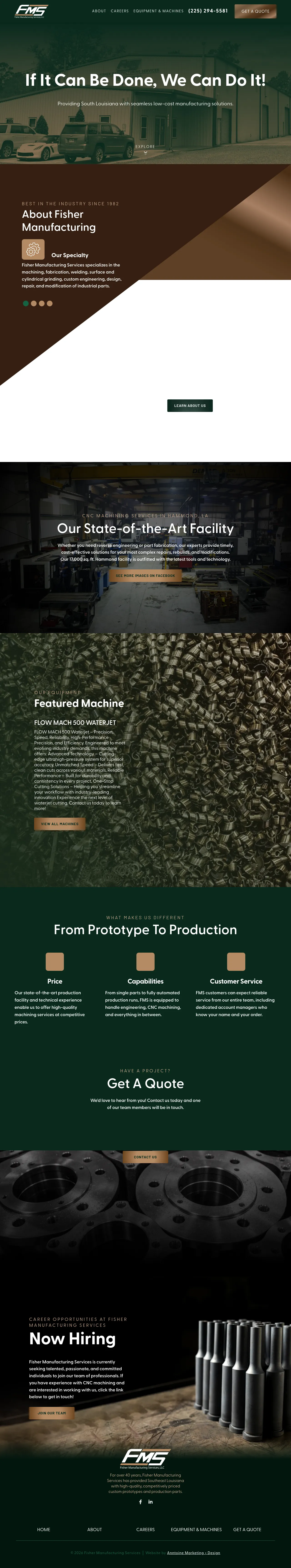 Fisher Manufacturing Services produces custom prototypes and production parts for industrial clients in Southeast Louisiana. The company provides CNC programming, setup, fixturing, tooling and machining along with reverse engineering, repairs, rebuilds and part modifications. Its 17,000 sq. ft. facility in Hammond is equipped with modern machining tools to support single-piece work through automated production runs.