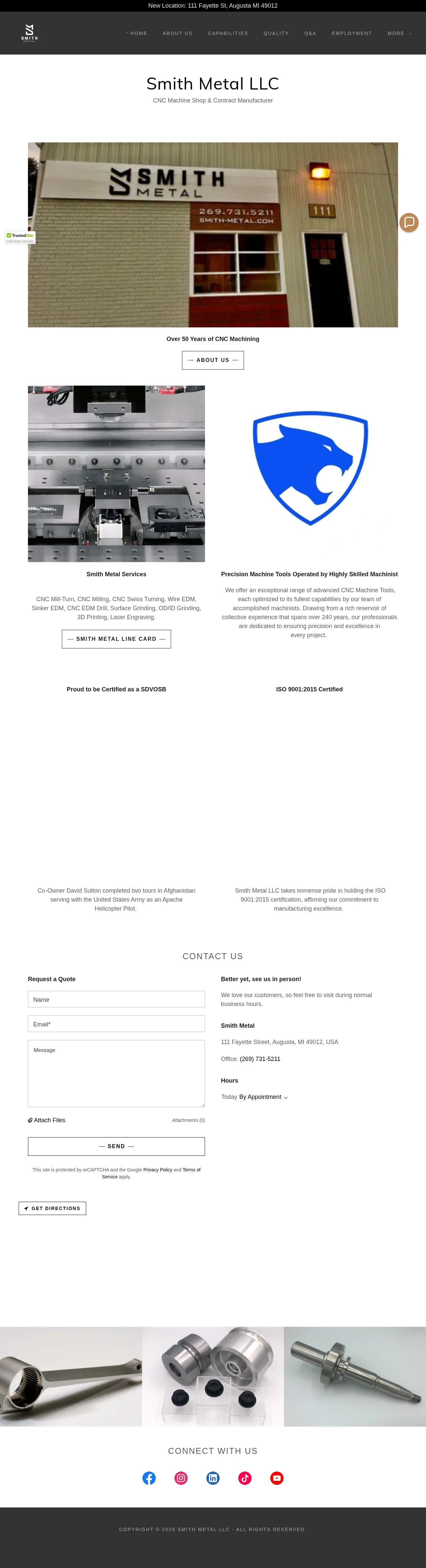 Smith Metal is a precision machining company providing manufacturing services for over 50 years. The company specializes in CNC milling, turning, Swiss machining, EDM, and comprehensive fabrication processes. They support a wide range of industries with prototyping and high-volume production capabilities, including material processing from basic metals to specialized alloys. With a focus on technical expertise and rapid response, they offer integrated services ranging from additive manufacturing to final surface finishing and heat treatment. The facility operates with modern machinery and maintains strict quality standards to ensure tight-tolerance results for demanding project requirements.