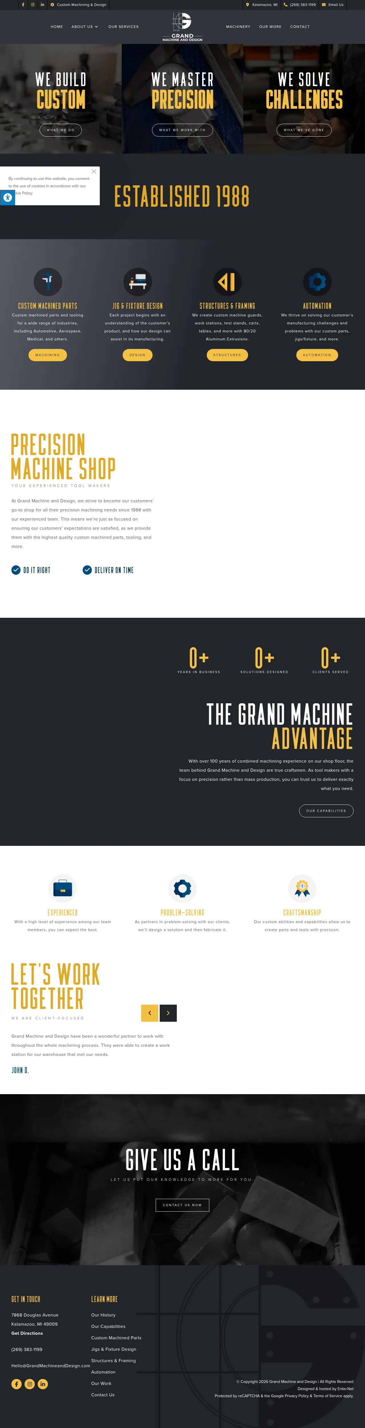 Grand Machine and Design is a precision machine shop established in 1988 that specializes in custom manufacturing and tooling solutions. Serving industries such as automotive, aerospace, and medical, the company focuses on delivering high-precision components and complex assembly structures. Their capabilities range from CNC machining and wire EDM to the design and implementation of automated robotic systems and ergonomic workstations. The firm emphasizes craftsmanship, combining decades of experience to solve unique manufacturing challenges through a collaborative engineering approach. They operate with a focus on delivering quality parts, prototypes, and integrated control solutions tailored to specific customer specifications.