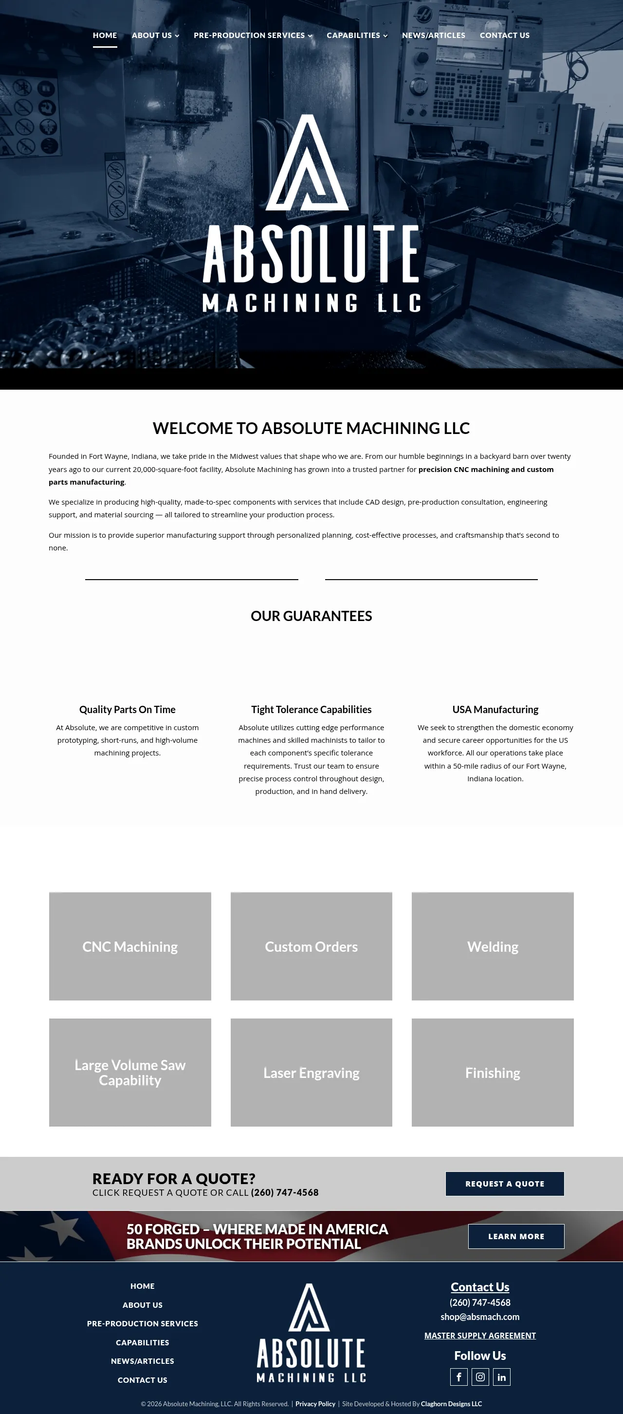 Absolute Machining LLC is a precision manufacturing facility based in Fort Wayne, Indiana, specializing in CNC machining and custom parts production. The company provides comprehensive support ranging from pre-production design and engineering consultation to final part finishing and assembly. Their capabilities include CNC turning and milling, precision welding, and various coating and surface treatments such as anodizing and powder coating. Serving a diverse range of industries including the archery and firearms sectors, they maintain strict tolerance control for both prototyping and high-volume production projects. With over two decades of experience, the company emphasizes a domestic manufacturing model to ensure quality craftsmanship and reliable delivery.