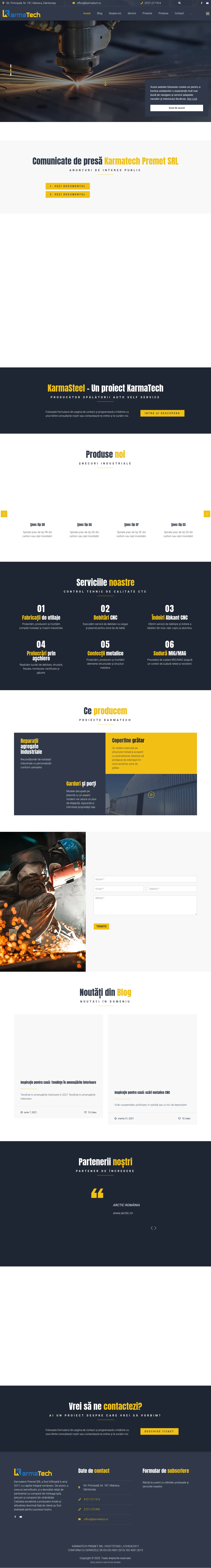 Karmatech Premet is a Romanian industrial manufacturing company specializing in the design, production, and installation of industrial machinery and metal structures. They provide comprehensive services for mineral aggregate production plants, including drying, dosing, and mixing systems, as well as industrial assembly and maintenance. Utilizing advanced CNC technology, the company offers precision metal processing for various sectors, including civil, industrial, and office construction. Their portfolio includes custom-made metal components, stairs, railings, and conveyor systems manufactured to specific client requirements. Committed to quality and technical precision, the firm maintains rigorous quality control standards throughout its production processes.