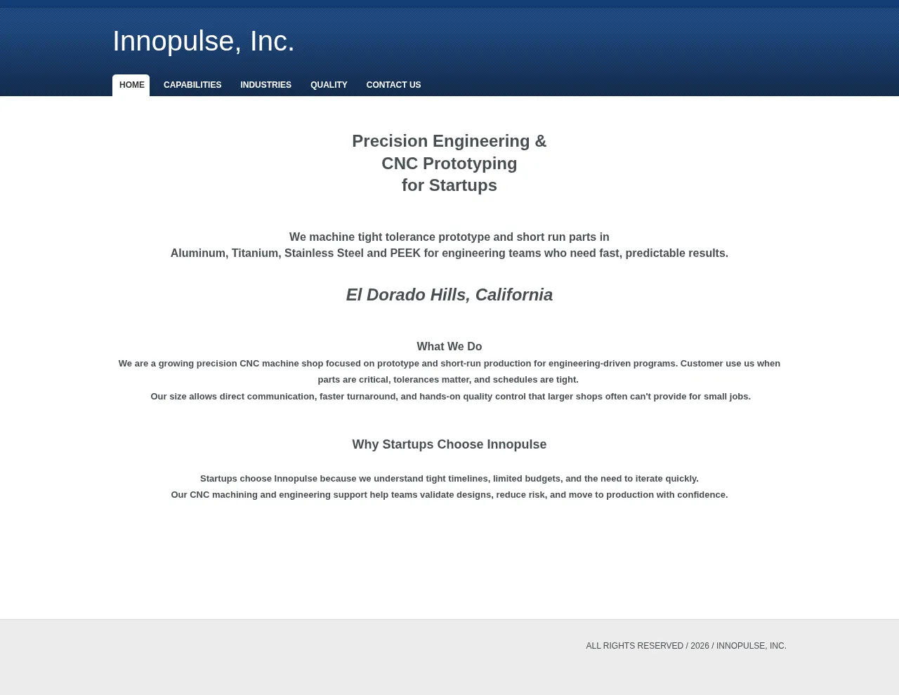 Innopulse, Inc. is a precision manufacturing facility based in El Dorado Hills, California, specializing in prototype and short-run production. The company provides machining services for tight-tolerance components, supporting early-stage product development and iterative design builds. Primary industries served include semiconductor equipment manufacturing and general engineering. Innopulse is structured to assist startups with accelerated timelines and low-volume production requirements. Through rigorous process control and engineering support, they facilitate design validation and risk reduction for their clients.