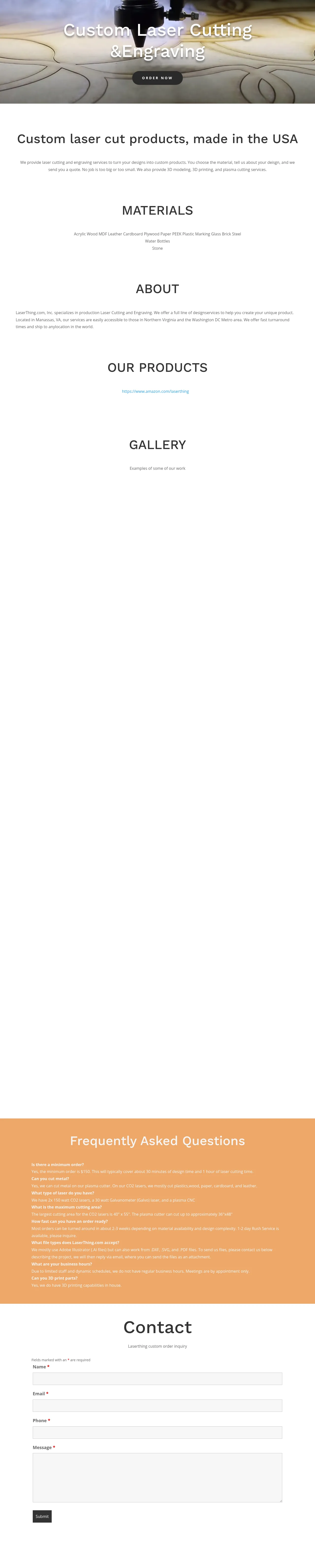 LaserThing.com, Inc. is a professional manufacturing service provider based in Manassas, Virginia, specializing in production laser cutting and engraving. The company offers end-to-end design assistance, 3D modeling, 3D printing, and plasma cutting services to transform custom designs into finished products. With a focus on both prototyping and production, they accommodate a wide range of project sizes and complexities for clients in Northern Virginia and worldwide. The facility utilizes advanced CO2 and galvanic laser technology, as well as CNC plasma cutting, to process diverse materials. All services are provided on an appointment-only basis to ensure dedicated attention to project specifications.