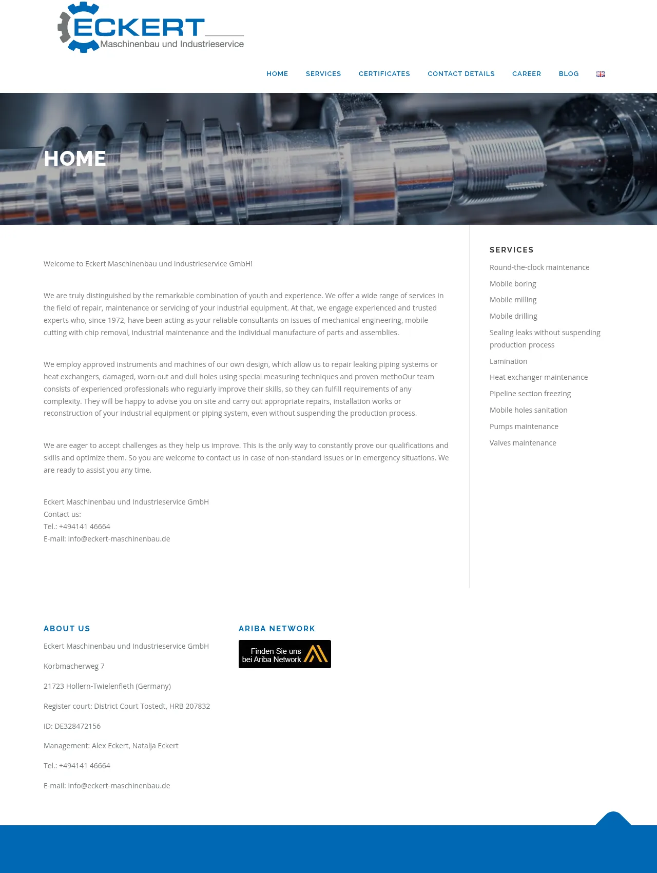 Eckert Maschinenbau und Industrieservice GmbH provides comprehensive mechanical engineering and industrial maintenance services. Operating since 1972, the company specializes in mobile on-site machining, including drilling, milling, and boring, as well as the repair of piping systems and heat exchangers. They offer specialized leakage sealing solutions that allow for maintenance to proceed without suspending production. The firm serves industrial clients by providing both custom component manufacturing and urgent emergency repair support. Their team utilizes proprietary equipment and advanced measuring techniques to ensure precision and operational efficiency for complex industrial infrastructure.