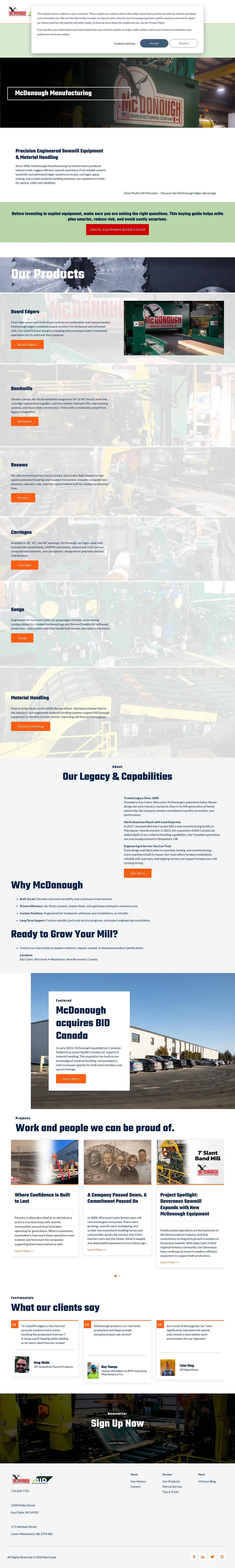 McDonough Manufacturing is a veteran forest products equipment provider specializing in the design and production of heavy-duty sawmill machinery. The company offers a comprehensive range of equipment including bandmills, resaws, edgers, carriages, and automated material handling systems. Serving both hardwood and softwood industries, they provide services ranging from custom engineering and fabrication to turnkey installations and factory-certified rebuilds. Through their Canadian subsidiary, BID Canada Ltd., the company also maintains extensive expertise in bulk material handling systems. With a legacy dating back to 1888, the firm focuses on improving mill uptime, yield, and operational efficiency through precision mechanical engineering.