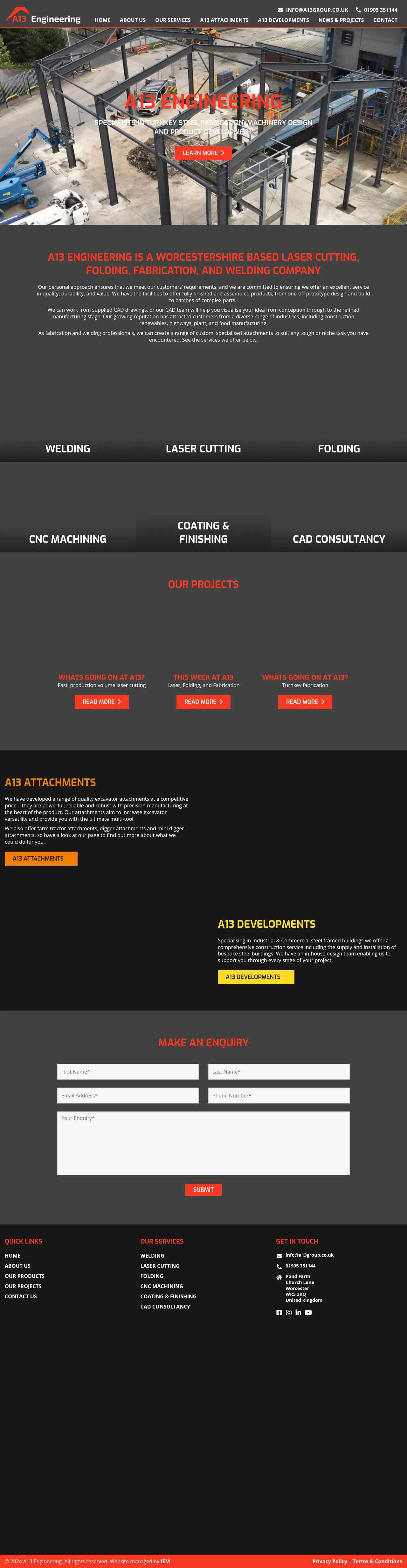 A13 Engineering is a Worcestershire-based manufacturer specializing in laser cutting, metal folding, fabrication, and welding services. The company provides turnkey manufacturing solutions, supporting clients from initial CAD concept and design through to final production. They serve a diverse range of sectors including construction, highways, food manufacturing, and renewable energy. A13 Engineering is also an established developer of robust excavator and agricultural tractor attachments designed for high-performance field use. Their facility is equipped for both precision batch work and specialized custom fabrication projects.