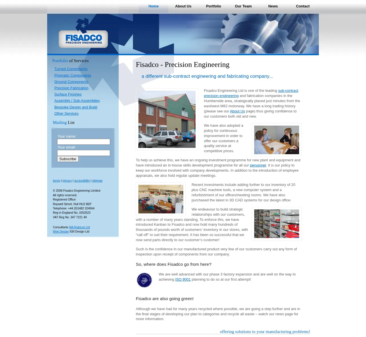 Fisadco Engineering Ltd is a subcontract precision engineering and fabrication company based in Kingston upon Hull, East Yorkshire, UK, located near the M62. The company manufactures turned, prismatic and ground components and provides precision fabrication, surface finishing, assembly and sub-assembly services, and bespoke design-and-build solutions. Fisadco invests in plant, CNC capacity and 3D CAD systems and operates an in-house skills development programme. It maintains quality management practices and long-standing customer relationships.