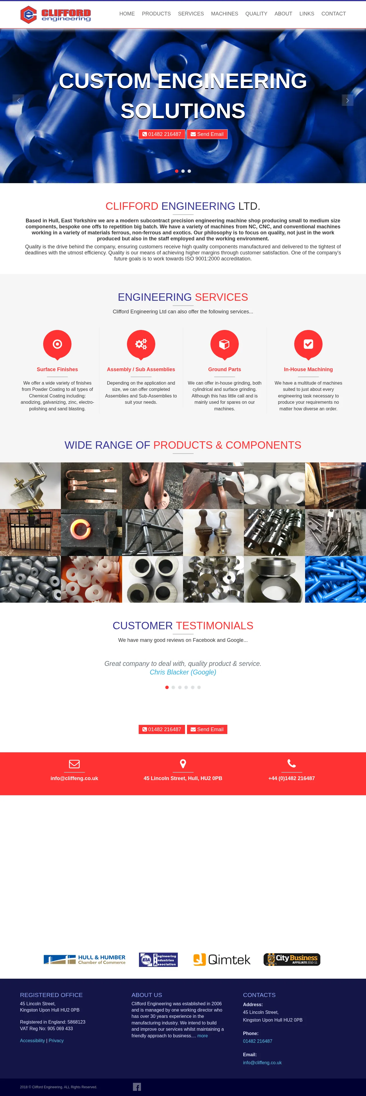 Clifford Engineering is a subcontract precision engineering machine shop based in Hull, East Yorkshire, producing small to medium-sized components from bespoke one-offs to larger production batches. Founded in 2006 and led by a director with over 30 years' manufacturing experience, the company operates NC, CNC and conventional machinery across a variety of materials. Services include in-house machining, cylindrical and surface grinding, surface finishing and assembly/sub-assembly work. The company emphasizes quality control and efficient delivery and has identified ISO 9001:2000 accreditation as a future objective.