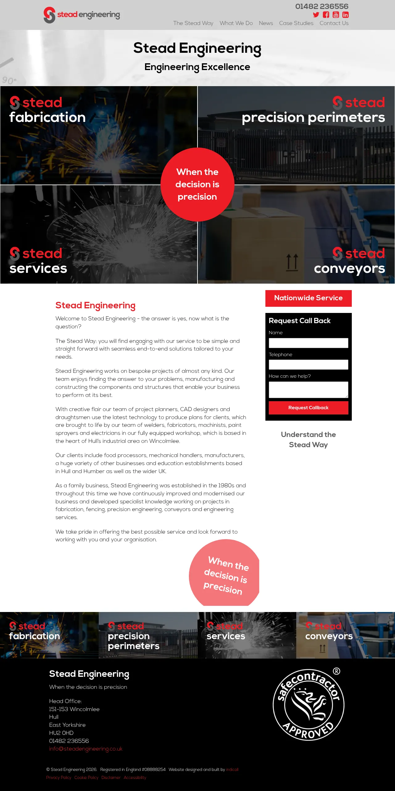 Stead Engineering Ltd is a family-owned engineering and fabrication company based in Hull. The business designs, manufactures and installs bespoke steel and aluminum components including conveyors, fencing and precision-machined parts. It also provides on-site remedial work, in-plant maintenance, conveyor servicing and 24-hour call-out support, with in-house CAD, welding, painting and electrical capabilities.